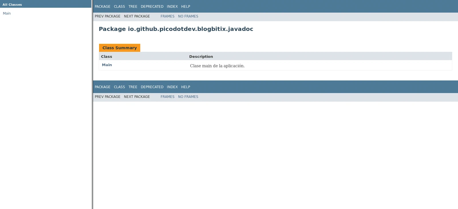 El código fuente completo del ejemplo puedes descargarlo del repositorio de ejemplos de Blog Bitix alojado en GitHub y probarlo en tu equipo ejecutando siguiente comando:./gradlew javadoc