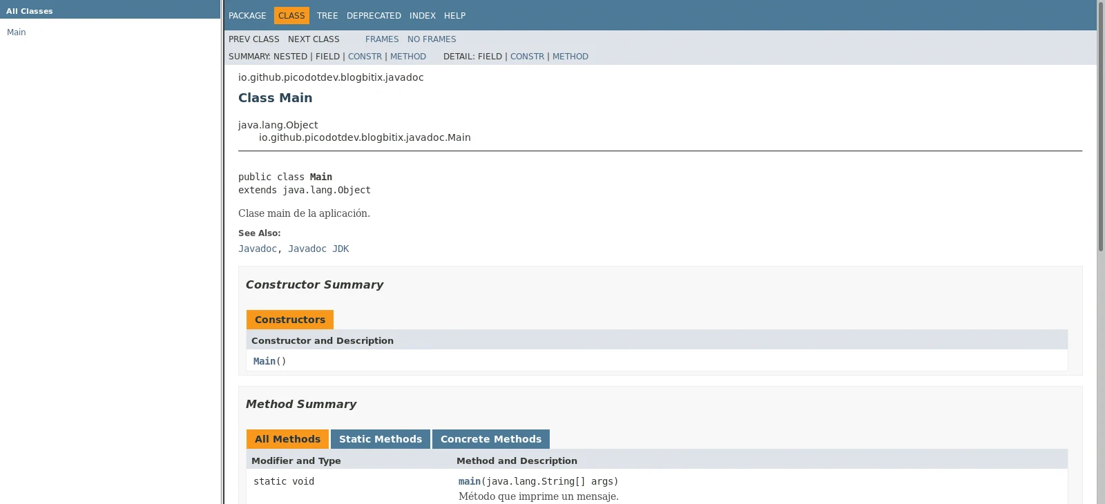 La propia documentación de las clases del JDK está generada con la herramienta Javadoc. Este es el aspecto de la documentación de este ejemplo que tiene exactamente el mismo aspecto que la del JDK.