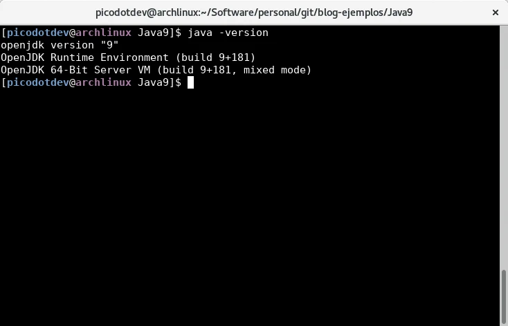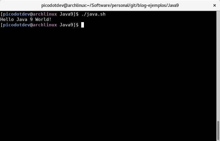 Este es el típico ejemplo Hola Mundo con Java 9 en que que muestro como compilar un programa usando los módulos y como ejecutarlo directamente desde la linea de comandos. En el código de la clase Main no hay ningún cambio respecto al que sería con una versión anterior de Java sin embargo se añade el nuevo archivo de código fuente module-info.java donde se definen sus dependencias que este programa no tiene salvo la implícita sobre el módulo java.base. Los comandos para compilar y ejecutar el ejemplo directamente con los comandos javac y java si cambian, ahora se usa en vez de classpath la opción module-path y se indica la clase del módulo que contiene el método main del programa, comparar con un ejemplo en Java 8 o anteriores versiones.