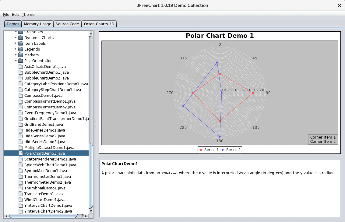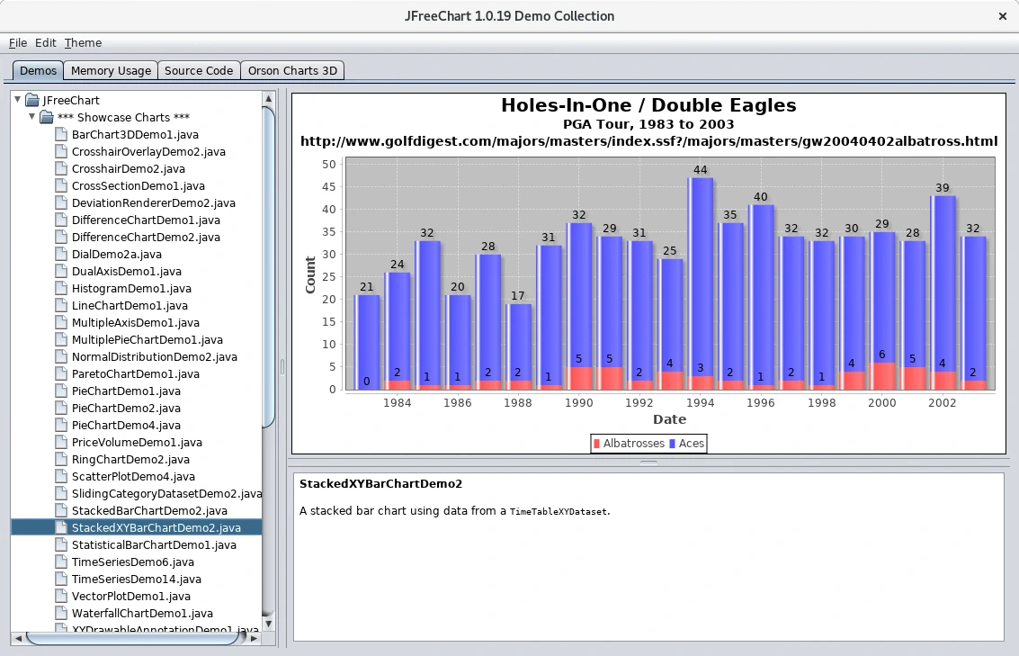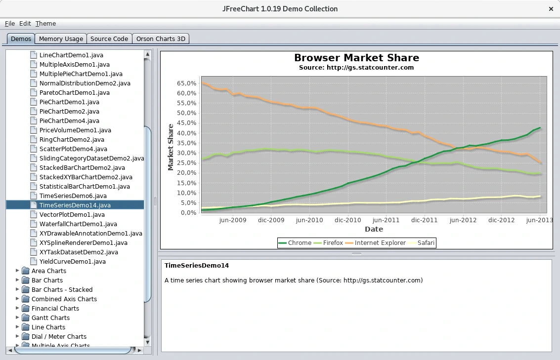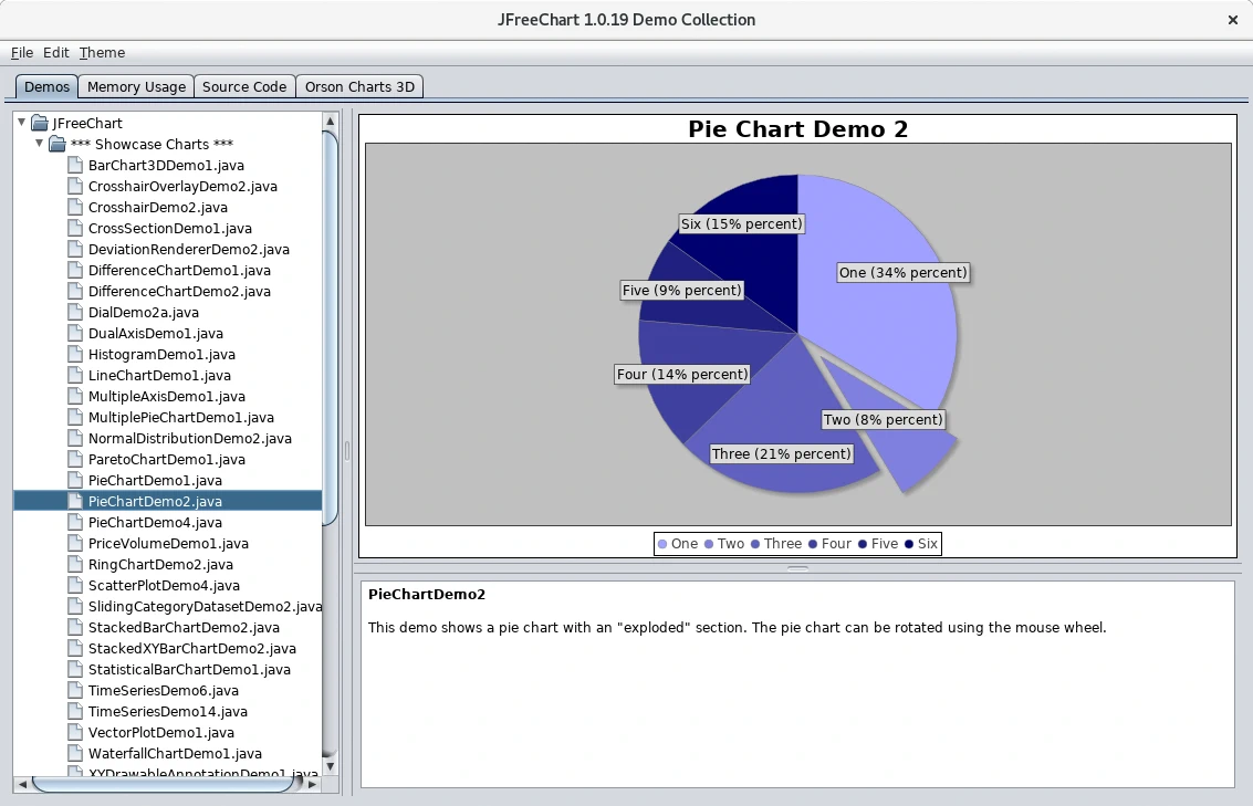 JFreeChart es una librería Java que permite generar gráficas de diferentes tipos con la que visualizar datos. Con esta librería de software libre que tiene una licencia LGPL es posible generar gráficas de histograma, de área, de barras, de barras apiladas, con ejes combinados, financieras, de Gantt, de líneas, diales, con múltiples ejes, sobrepuestas, tartas, estadísticas, de series temporales, xy y otros tipos, a algunas es posible darles un aspecto en tres dimensiones. Las gráficas las podemos exportar a archivos de imagen png, jpg o formatos escalares como svg con lo que serán utilizables de múltiples formas, por ejemplo, incluyendo las gráficas en archivos PDF o si la aplicación es una aplicación web devolver las imágenes al navegador para que las visualice, usando JasperReports para generar informes es posible incluir las imágenes generadas por JFreeChart.