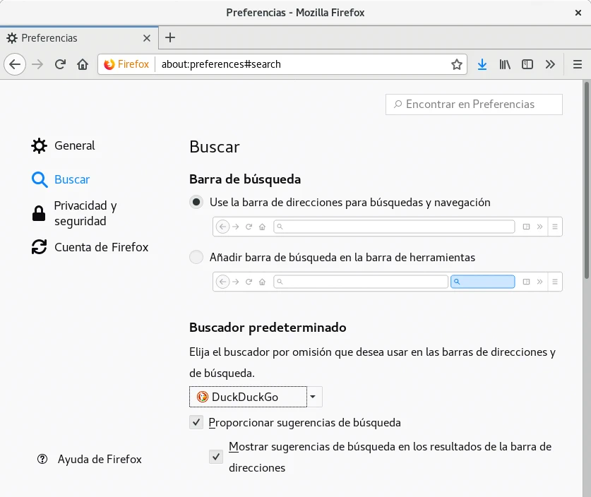 Firefox tiene la opción de convertir DuckDuckGo en el buscador predeterminado en el apartado de Preferencias y sección Buscar.