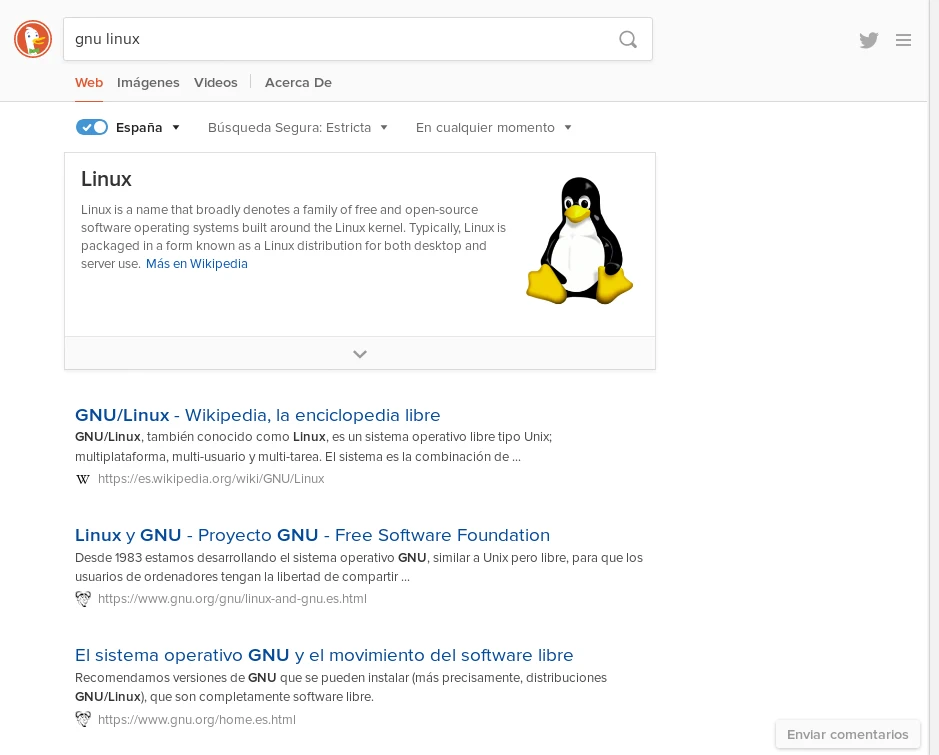 También se pueden hacer búsquedas de imágenes, vídeos o noticias. Los resultados que ofrece DuckDuckGo son bastante buenos, sino mejores que los de Google, y en los casos que no acierte se puede buscar con !g en Google. Desde hace mucho tiempo DuckDuckGo es el único buscador que uso, #ComeToTheDuckSide.