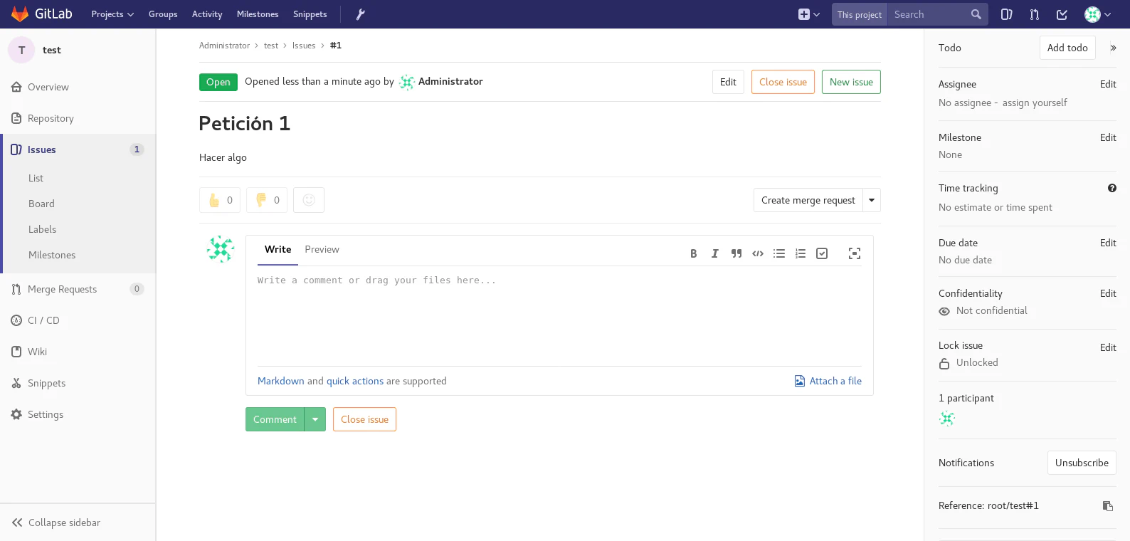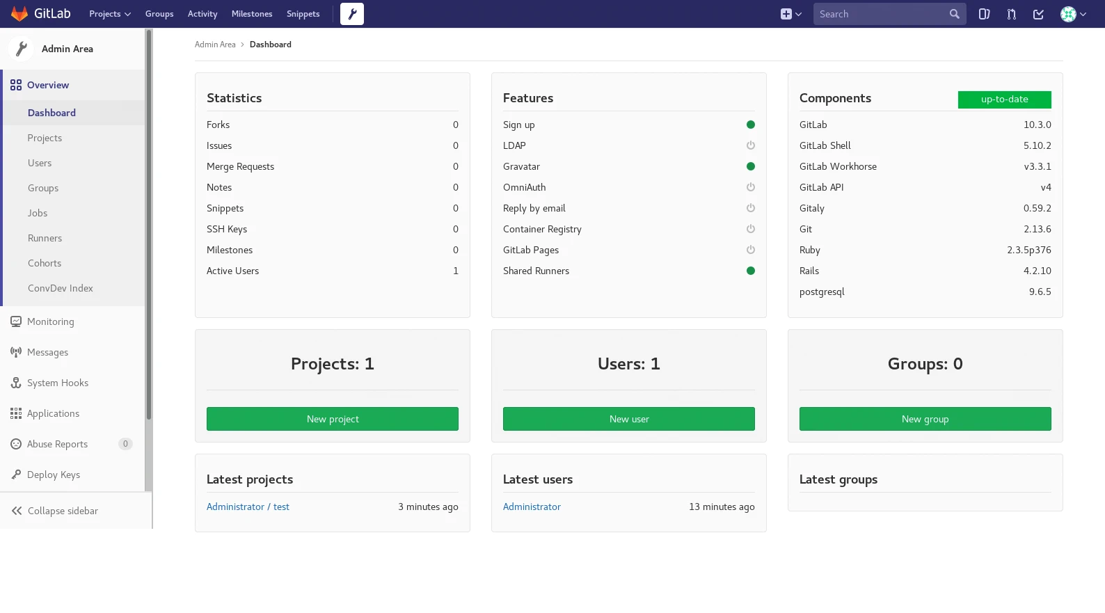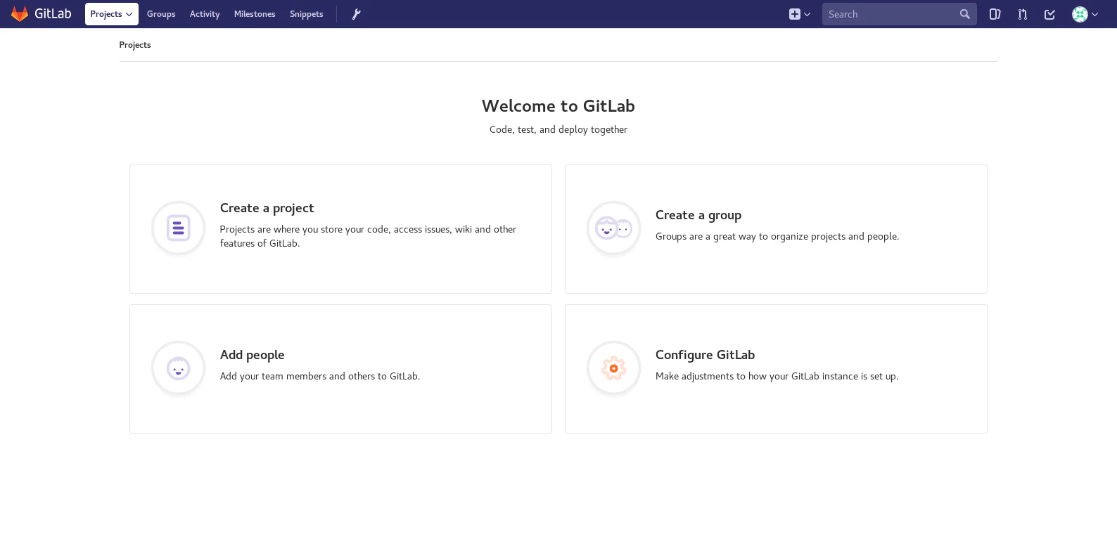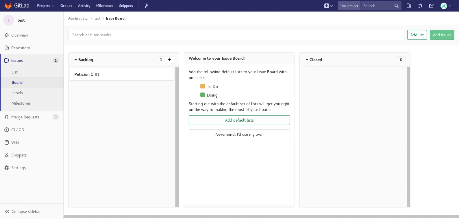 Iniciada sesión ya se puede empezar a usar GitLab a crear usuarios con sus claves SSH, repositorios de Git pudiendo importar otros existentes, crear nuevos, páginas de una wiki y peticiones, integración y entrega continua y personalizar el panel kanban con el flujo que deseamos que sigan las peticiones en la organización, por ejemplo, planning, ready, doing, review, merged y deployed.