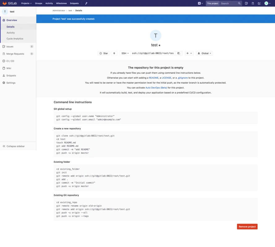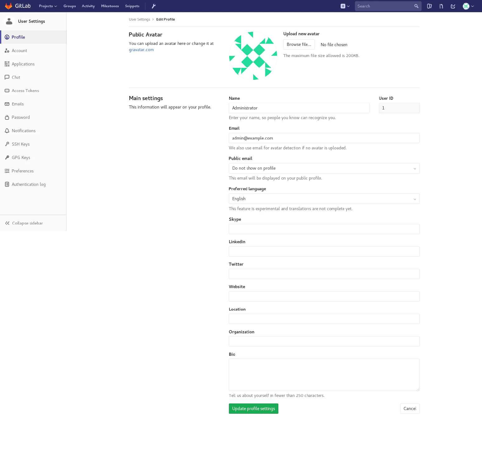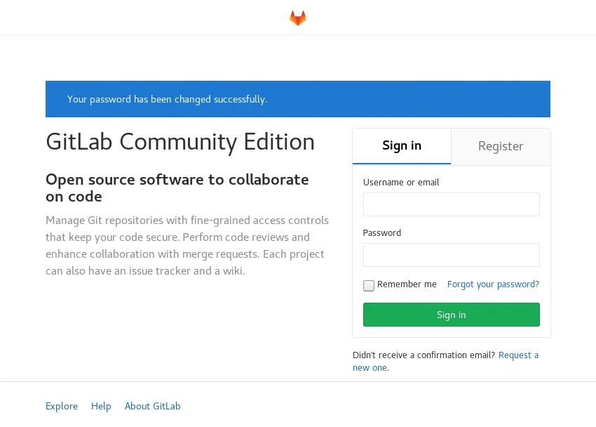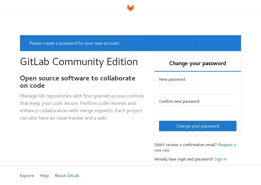 Usando Docker y el siguiente archivo de Docker Compose basta el comando docker-compose up para iniciar GitLab. Instalado GitLab de alguna de las formas anteriores usando un navegador web y con la dirección https://gitlab (configurados los certificados SSL y la ubicación de los volúmenes) se accede a la aplicación de GitLab, donde inicialmente se pide la contraseña del usuario administrador root con la que iniciar sesión y realizar las tareas administrativas como crear otros usuarios y proyectos.