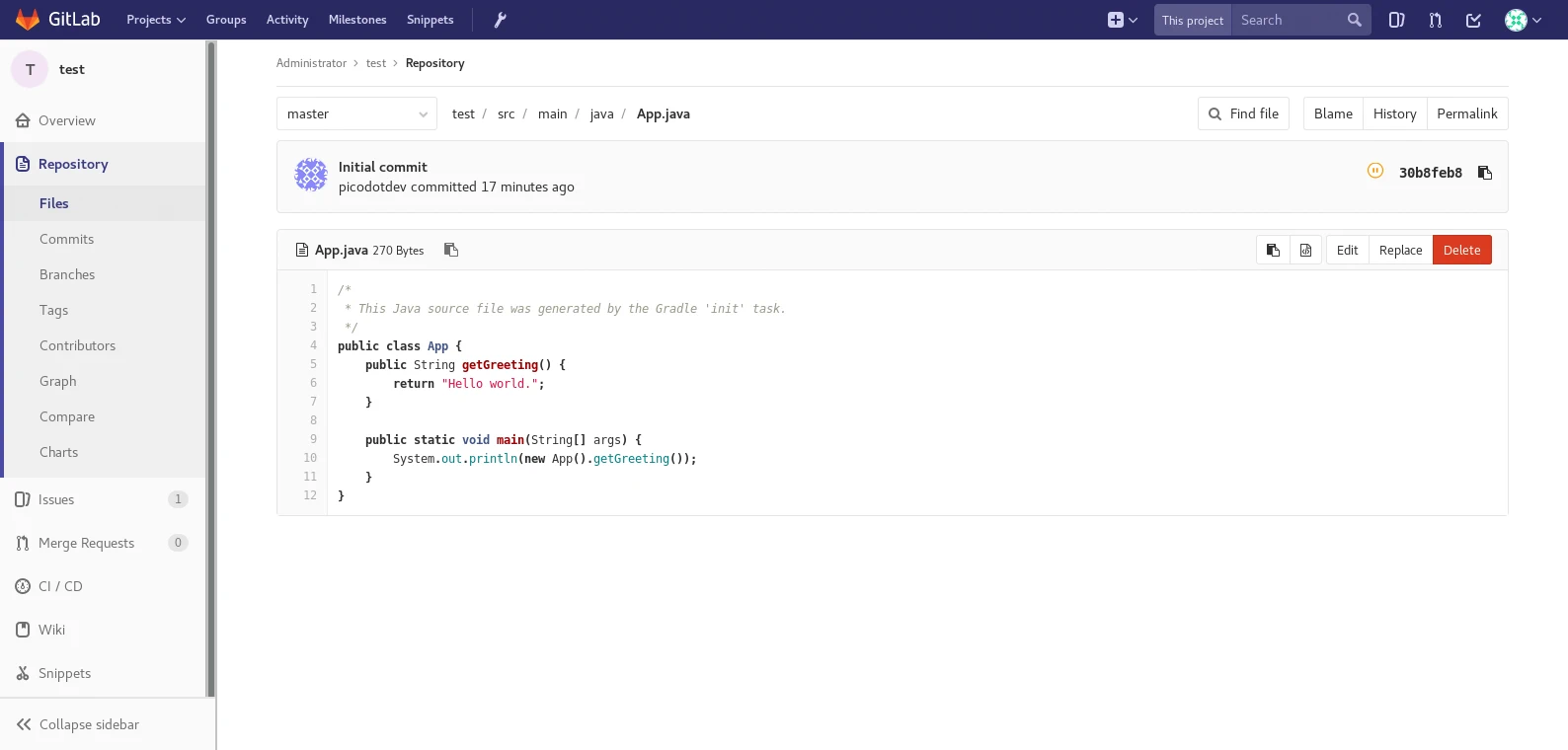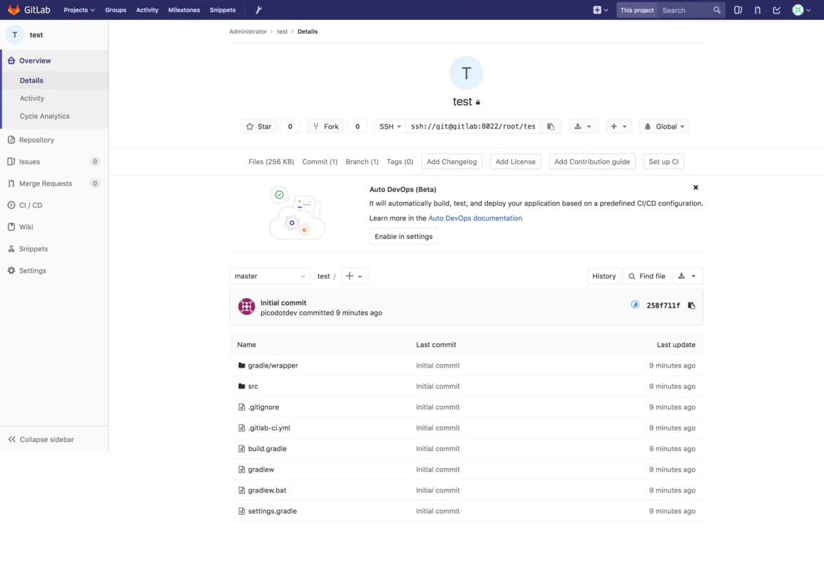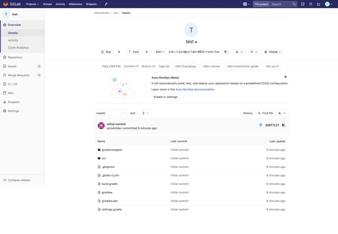 Creado un proyecto GitLab e introducida la clave pública SSH nos proporciona la dirección URL con la que se puede clonar, convertir una carpeta existente en un repositorio o añadir un repositorio existente. Una vez con el repositorio en el sistema de archivos local se puede empezar a subir, modificar y eliminar archivos del repositorio de control de versiones. Hecho algún commit y subido algún archivo desde GitLab se puede ver el contenido del repositorio de Git.