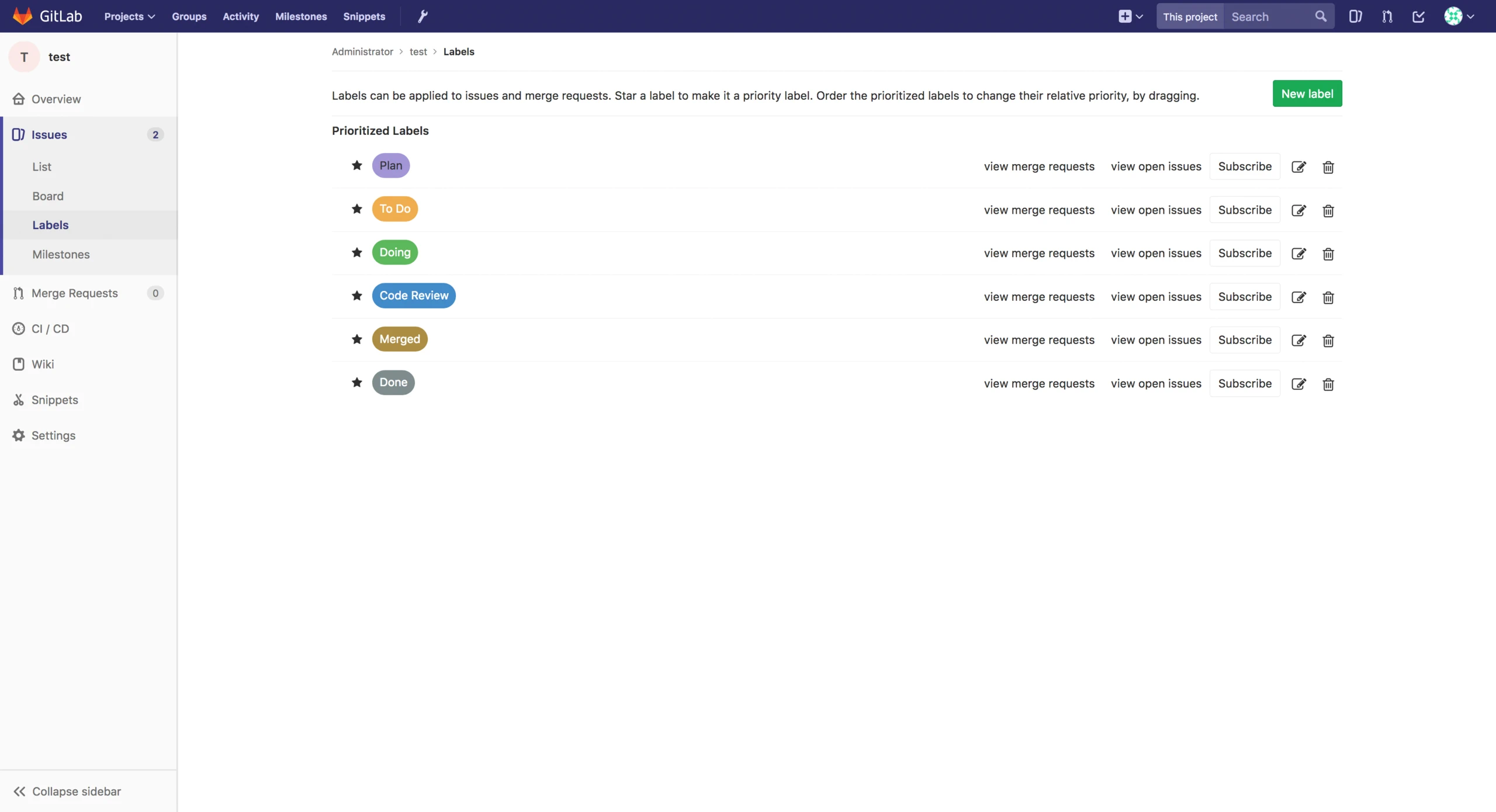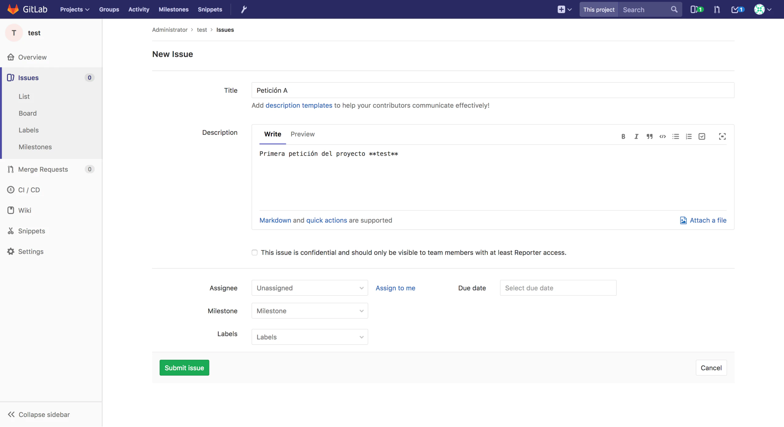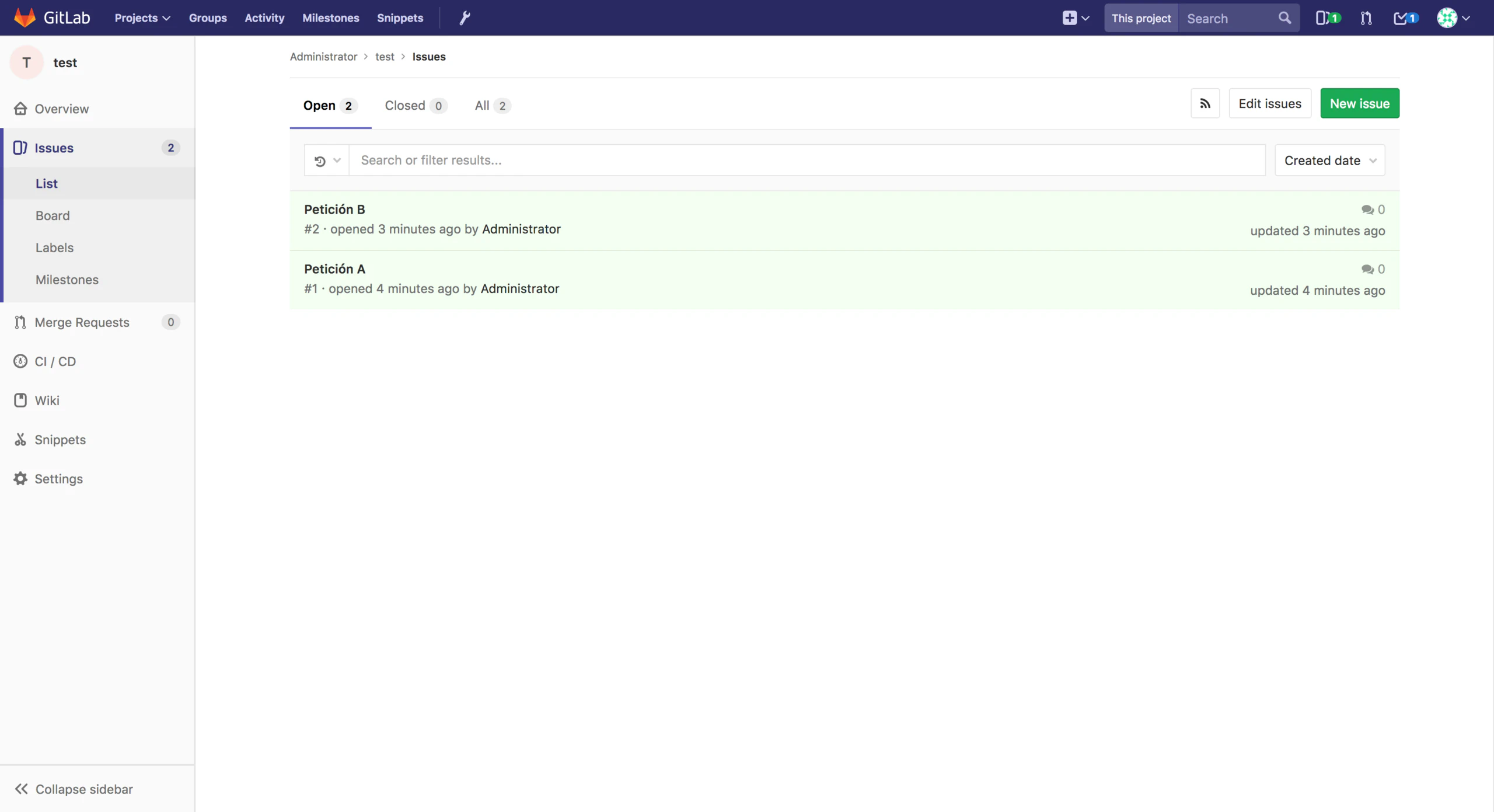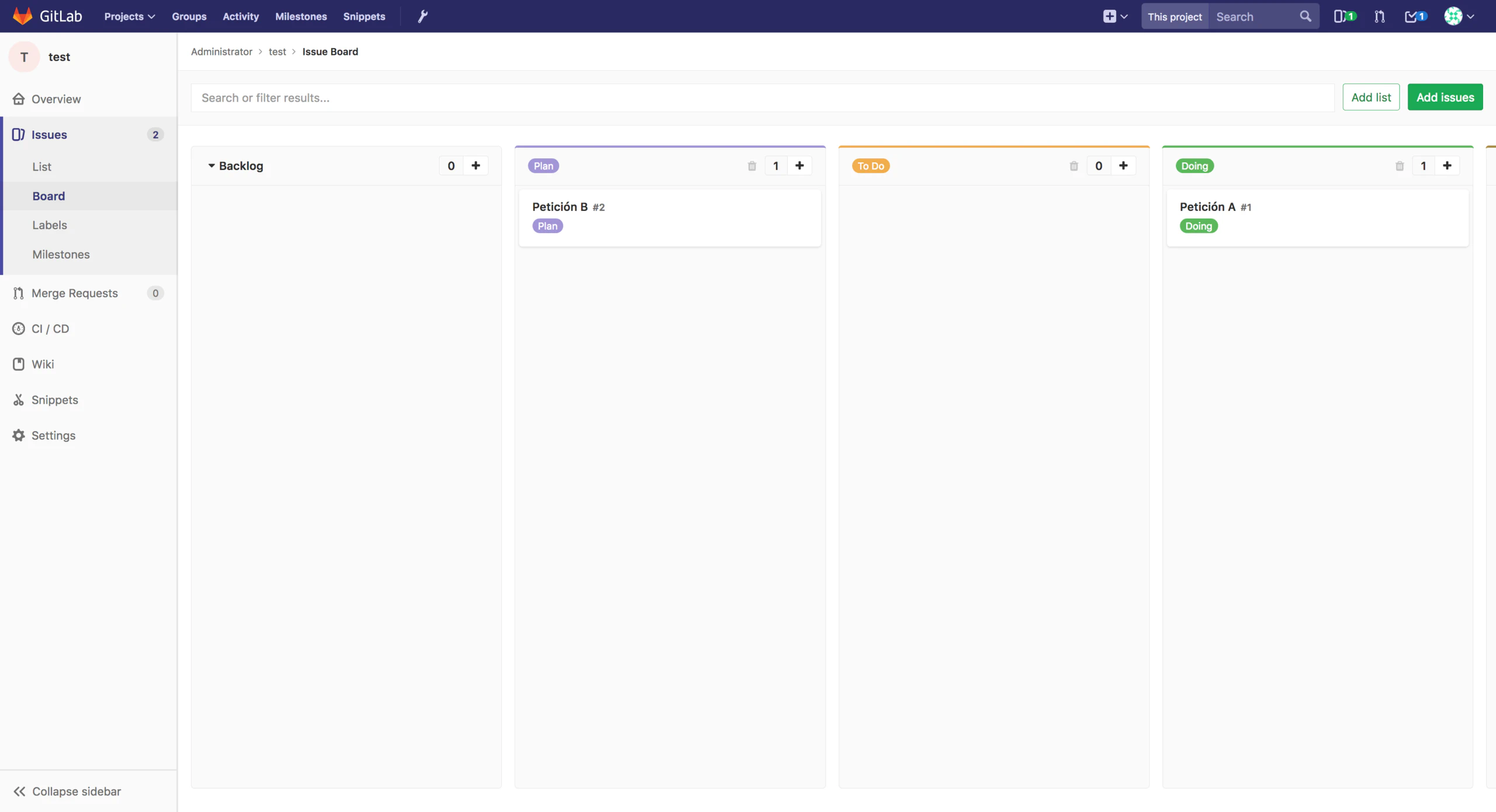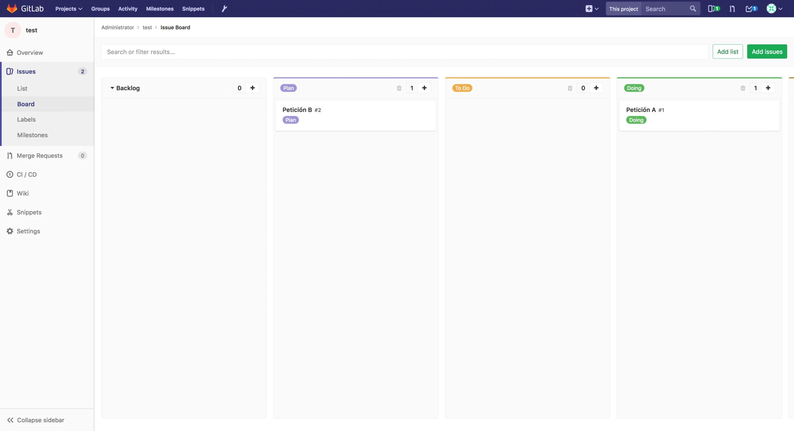 Para crear una nueva petición hay que acceder en el proyecto a Issues y pulsar el botón New Issue. Rellenados los datos del formulario de creación se puede consultar desde Issues > List para verlas en formato lista o Issues > Board para verlas en formato panel Kanban. El panel Kanban se puede modificar y asignando etiquetas a las peticiones crear columnas adaptado al flujo de trabajo de una organización. Con formato de las descripciones de las peticiones permite hacer referencia a otras o incluir menciones a otros usuarios.