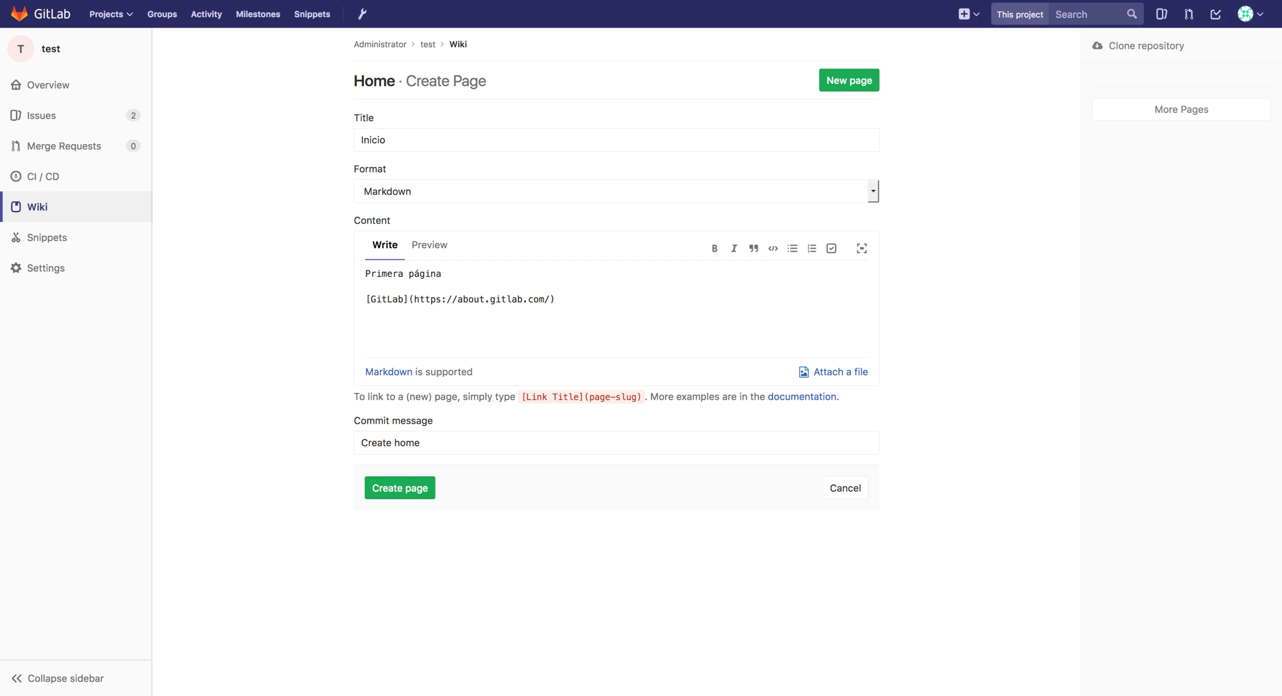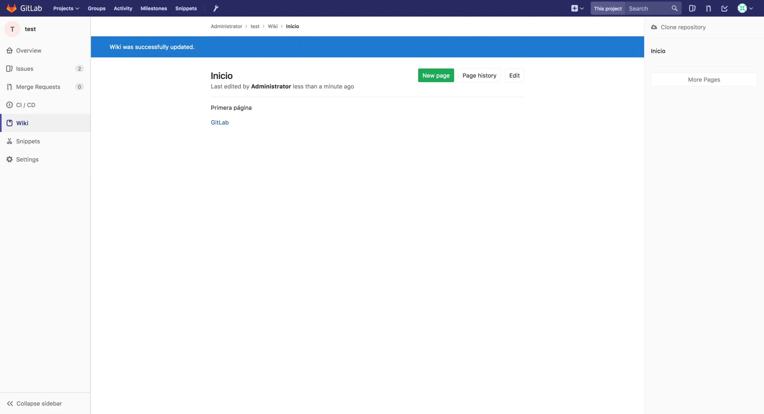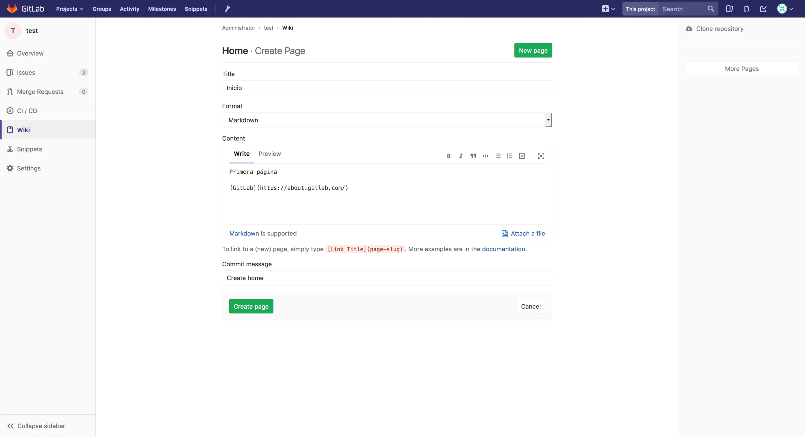 Cuando se accede por primera vez a la wiki se crea la página de inicio que se puede editar o crear nuevas páginas. Las páginas de la wiki se escriben en formato Markdown y se guarda un historial de las ediciones que se han realizado a cada página.