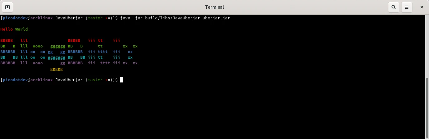 Con el siguiente comando la ejecución de la aplicación empaquetada como uberjar produce el mismo resultado. Con el uberjar en el archivo de manifiesto no es necesario incluir el atributo Class-Path ya que todas las clases necesarias tanto de la aplicación como de las dependencias ha sido empaquetadas en el jar.