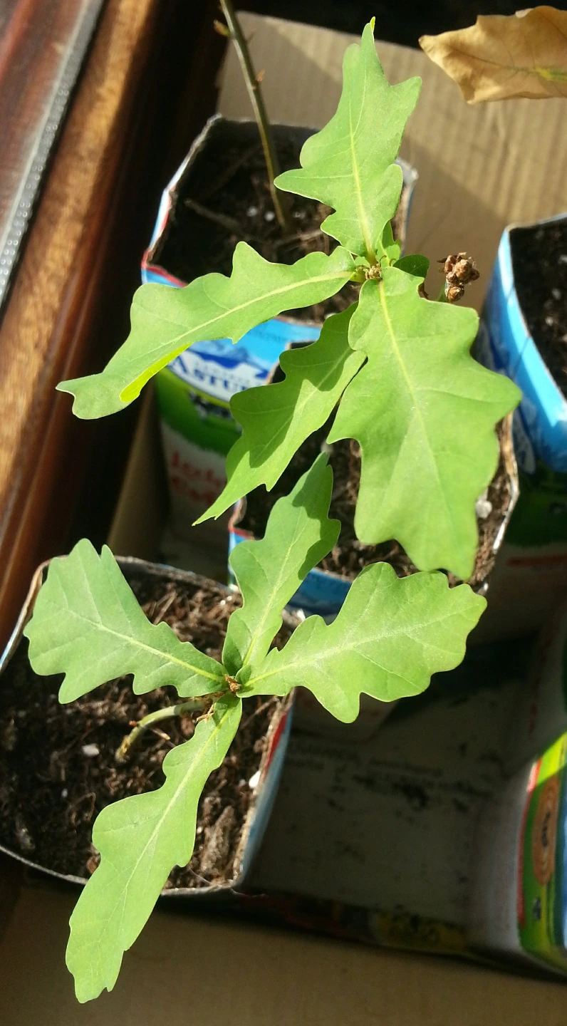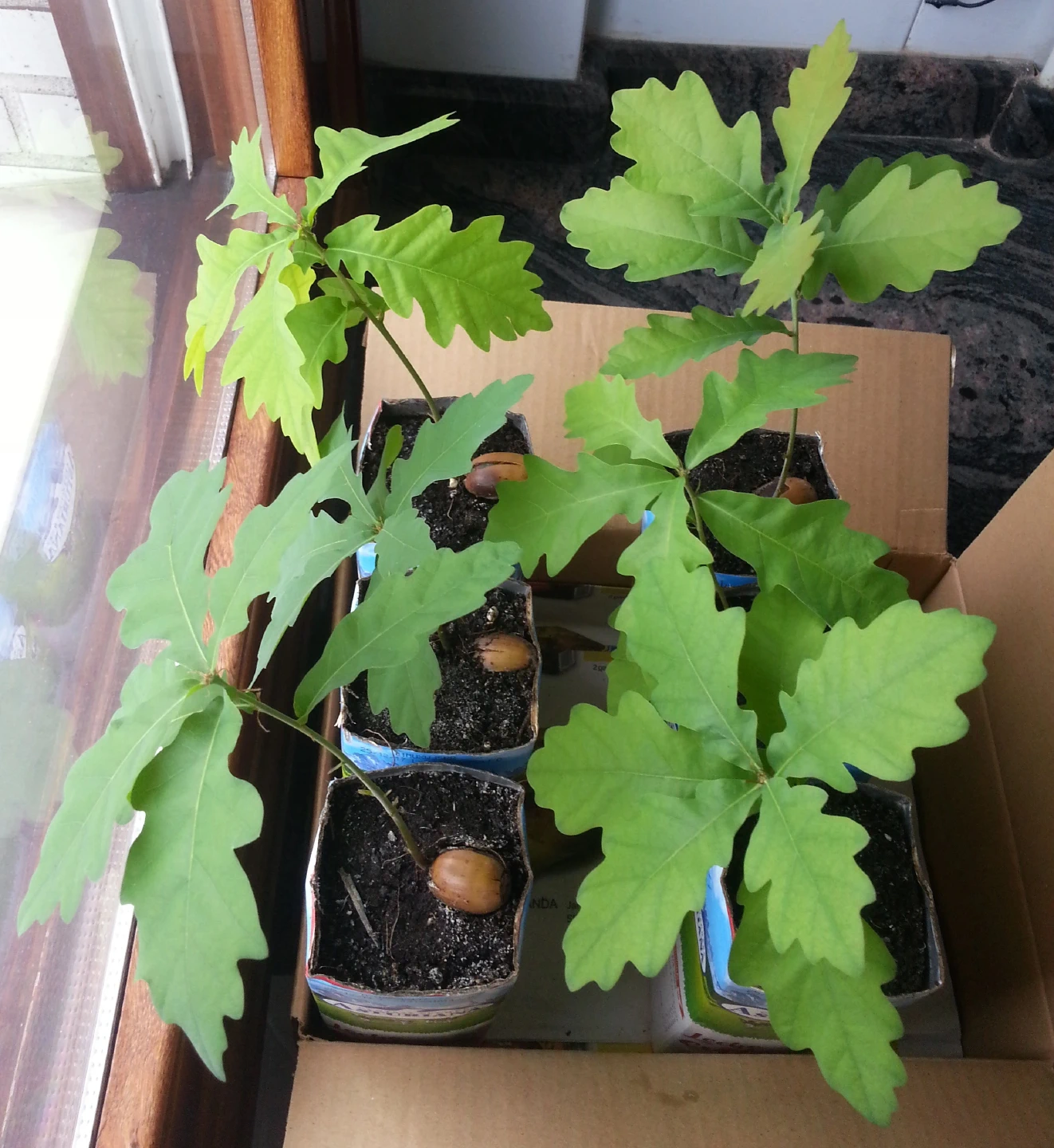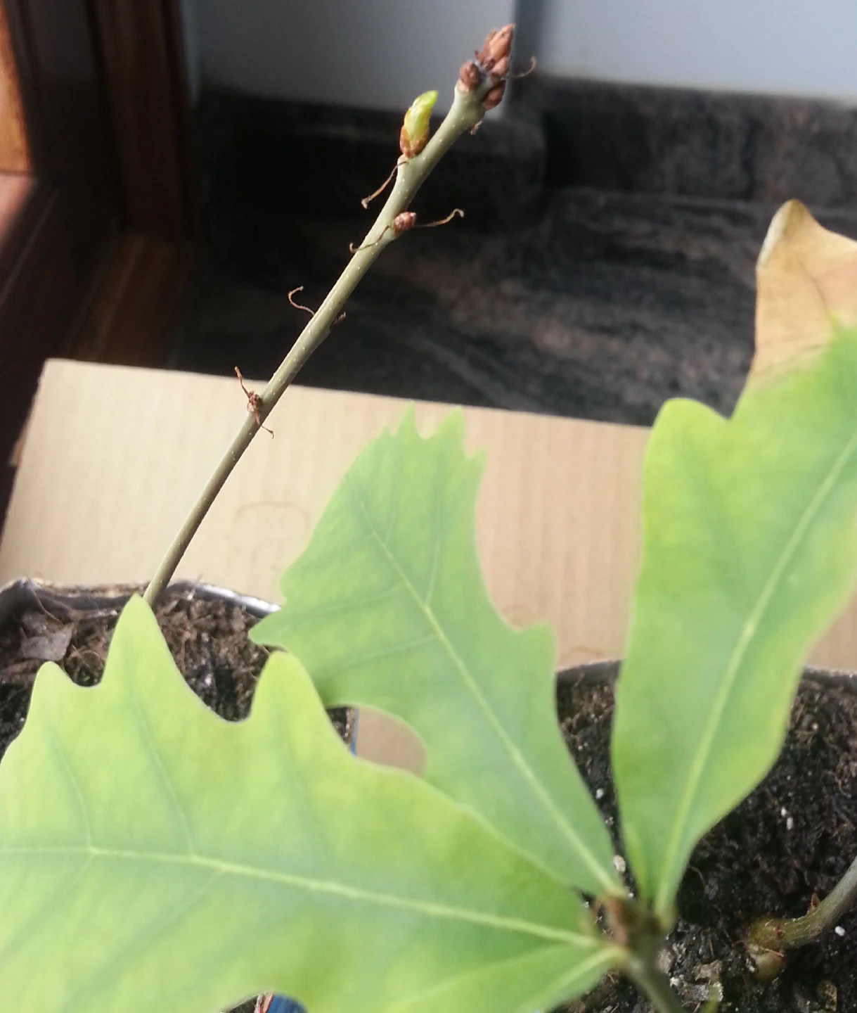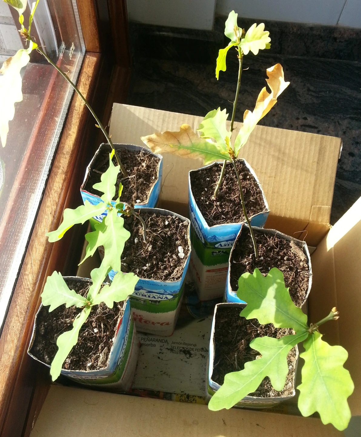 Ya han pasado varios meses desde que hice germinar en septiembre varias bellotas de roble, ha pasado el invierno, ha llegado la primavera y ahora tengo unos pequeños plantones de roble. Al germinar y crecer hasta la altura entre unos 10 o 15 centímetros en un primer momento desarrollaron unas siete hojas de un tamaño bastante grande. Con el invierno las hojas se les comenzaron a amarillear y aún en mayo todavía tienen varias aunque en algún momento se les caerán, cuando veo que la hoja ya está bastante amarilla pruebo a ver si la hora se desprende fácilmente sin hacer mucha fuerza.