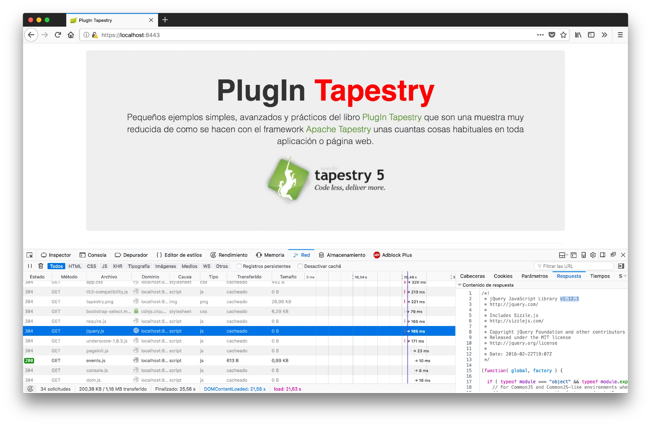 Sin embargo, las versiones de las librerías de lado del cliente que incorpora de serie son antiguas. En la versión 5.4.3 de RequireJS se incorpora la versión 2.1.17, de jQuery la versión 1.12.1 y de Underscore la versión 1.8.3 cuando en el momento de publicar este artículo sus versiones más nuevas son 2.3.5, 3.3.1 y 1.9.1 respectivamente. Dado que de Apache Tapestry no se publican versiones frecuentemente el framework no sigue el ritmo de actualizaciones más rápido de las librerías JavaScript. Pero pueden ser actualizadas sin mucho esfuerzo.