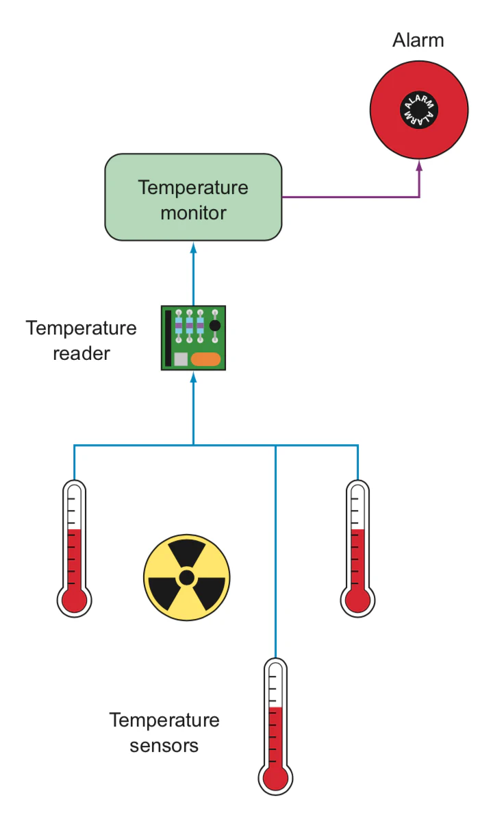 En el ejemplo se quiere probar un sistema de alarma que cuando detecte en tres mediciones consecutivas que la temperatura está por encima de cierto valor suene una alarma. Los elementos de este sistema serán una clase Monitor que obtiene las temperaturas de un sensor y si detecta la condición de una temperatura elevada hace sonar una alarma. El monitor será el sujeto bajo prueba y el sensor y la alarma los colaboradores. El sensor será un fake de tipo stub ya que solo se necesita preprogramar sus valores de retorno de temperaturas y la alarma un fake de tipo mock ya que se debe comprobar que el monitor ha llamado una vez al método que haría sonar la alarma, esto es se necesitan verificar las interacciones.