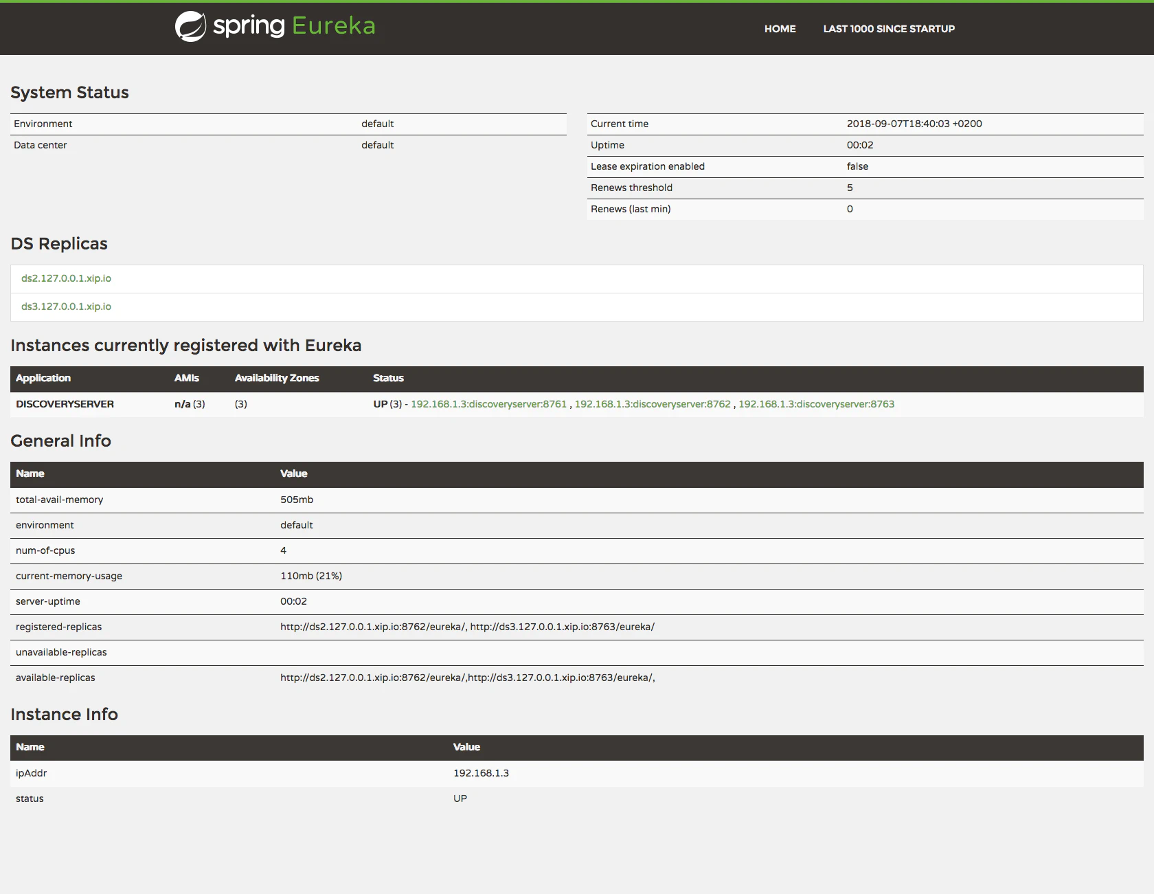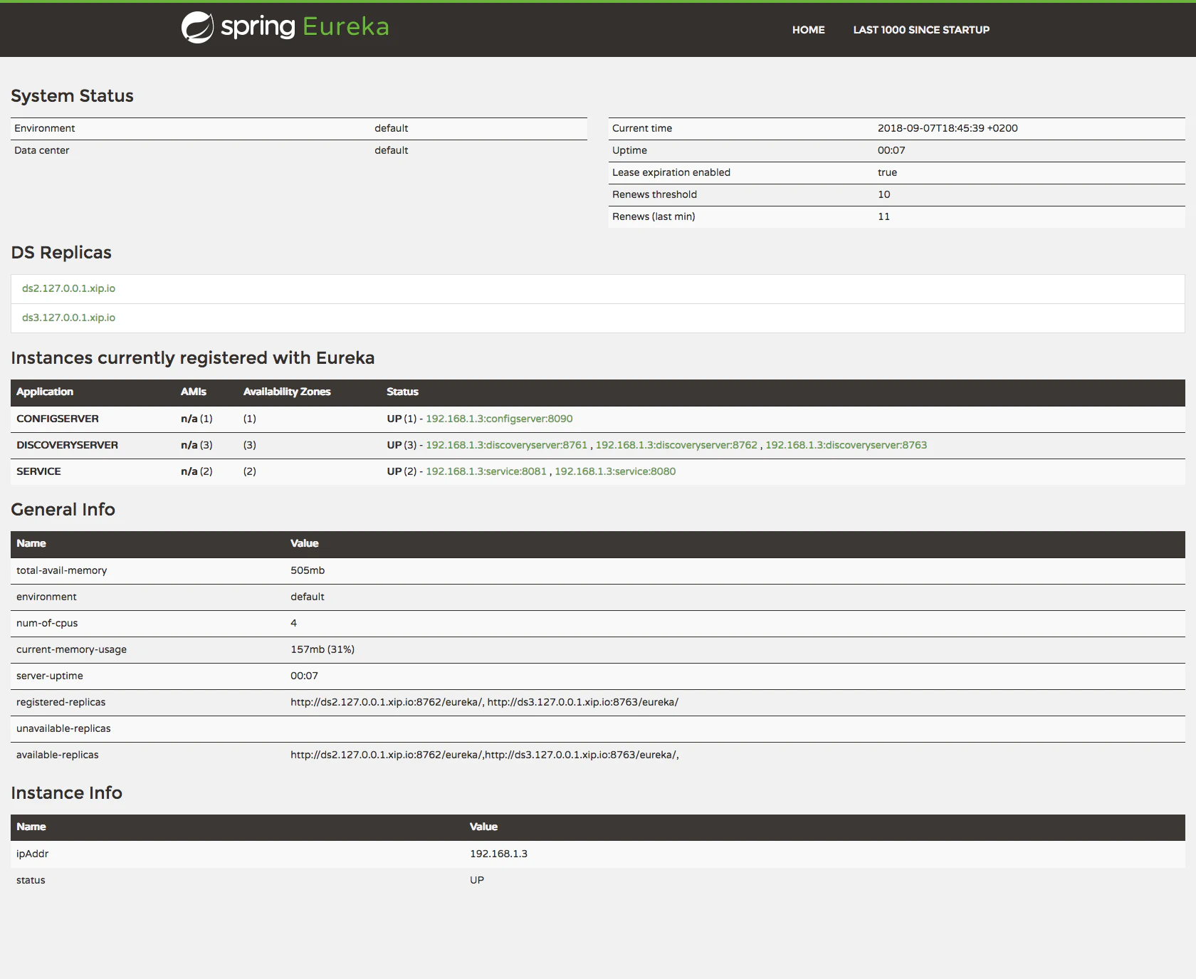 Una vez iniciados los servidores de descubrimiento en la página dashboard de cualquiera de ellos cambiando el puerto de la dirección http://ds1.127.0.0.1.xip.io:8761/ se observan varias propiedades como la lista de servidores del cluster, las réplicas registradas y disponibles y los servicios registrados con su ubicación y puerto. En este caso hay tres instancias del servicio de registro y descubrimiento, una de servidor de configuración y dos instancias de un servicio.