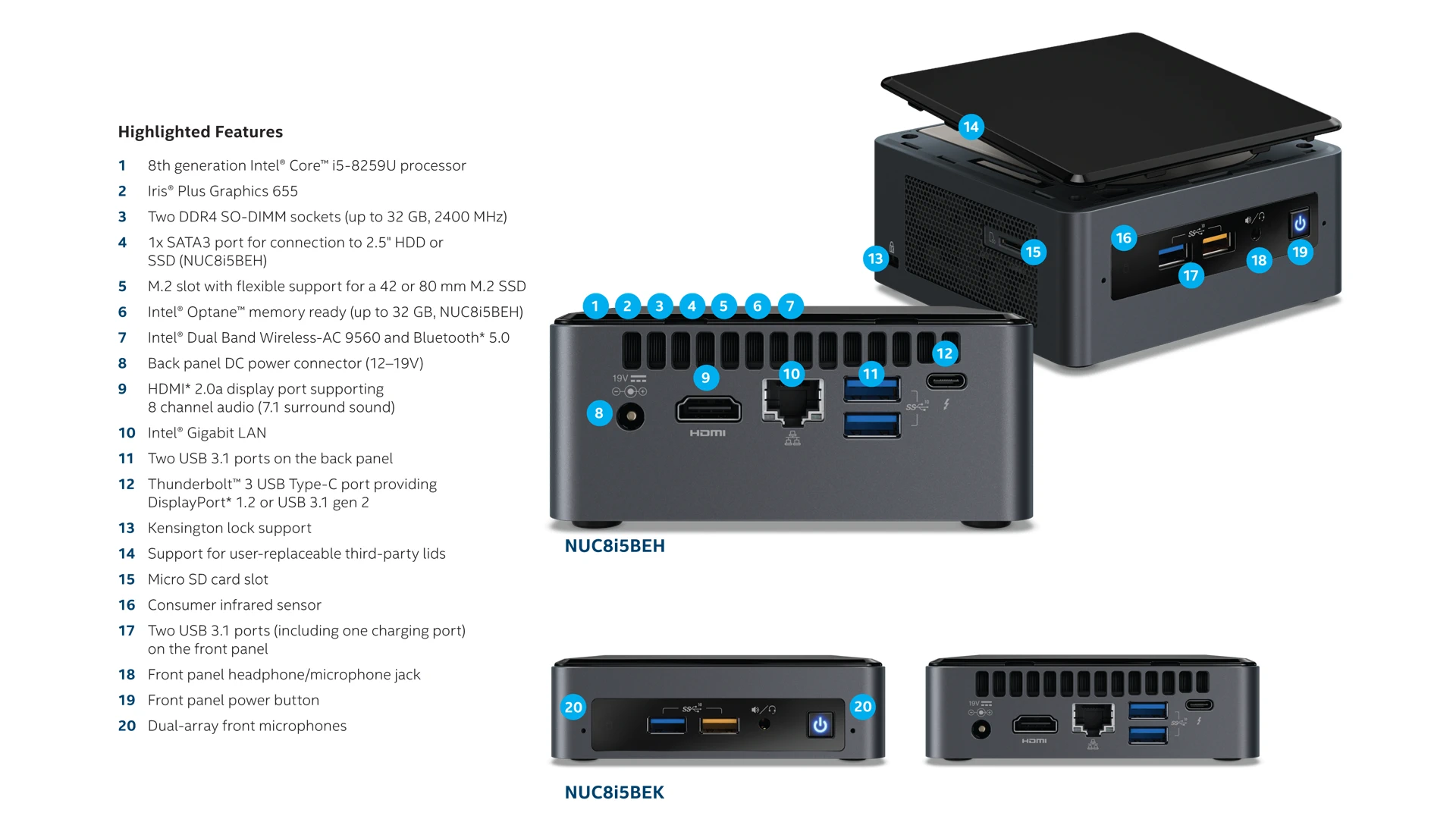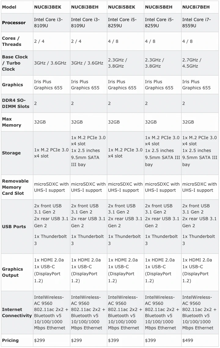 Todos poseen un puerto Ethernet Gigabit y WiFI AC con Bluetooth 5.0, una salida de vídeo HDMI 2.0a con soporte hasta 4K, salida Display Port 1.2 integrada en el conector USB Type-C, cuatro puertos USB dos en la parte frontal (uno con soporte carga) y dos en la parte trasera, además del conector para la fuente de alimentación que tiene un tamaño pequeño comparado con la de los Hades Canyon, en la parte frontal está el botón de encendido y un LED indicador de actividad del SSD junto con la salida de audio en formato jack 3.5mm. Los modelos acabados en K son más pequeños en tamaño vertical ya que no ofrecen bahía 2.5 pulgadas para un segundo disco duro con interfaz SATA III que si ofrecen los acabados en H. En un lateral se encuentra la ranura para tarjetas SDXC con soporte UHS-I en formato microSD. En el interior están los dos slots para la memoria pudiendo instalar hasta un total de 32 GiB DDR4 a 2400Mhz, también está el conector M.2 para un SSD con interfaz NVMe de longitud 2280 o 2242, también tiene un puerto SATA III.