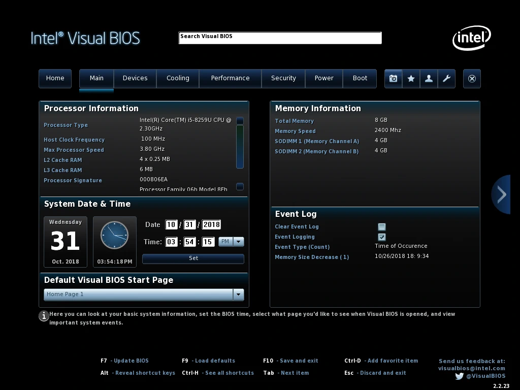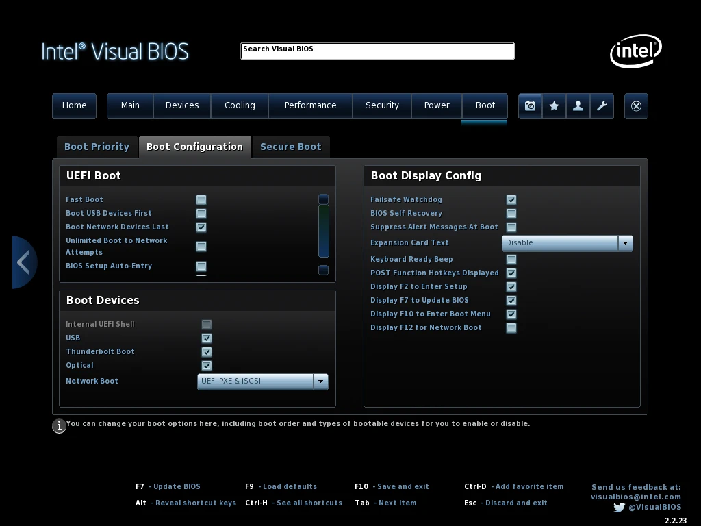 El NUC es realmente pequeño con sus 11x11cm ocupa muy poco espacio, además la versión slim solo tiene 3,6 cm de altura. Para instalar el sistema operativo, en mi caso la distribución Arch Linux de GNU/Linux he tenido que deshabilitar el Secure Boot desde la BIOS a la que se accede pulsando la tecla F2 en el momento que se inicia el sistema, con la tecla F10 se puede elegir la unidad de inicio que será una memoria USB formateada con el medio de instalación, la tecla F7 sirve para instalar actualizaciones del firmware y BIOS cuando Intel los publica, el nuevo firmware se ha de guardar en una memoria USB formateada en FAT32. La BIOS es gráfica y se puede manejar con ratón con opciones que se muestran en las capturas. Por el contrario la selección de unidad de inicio y actualización del firmware son basadas en texto.