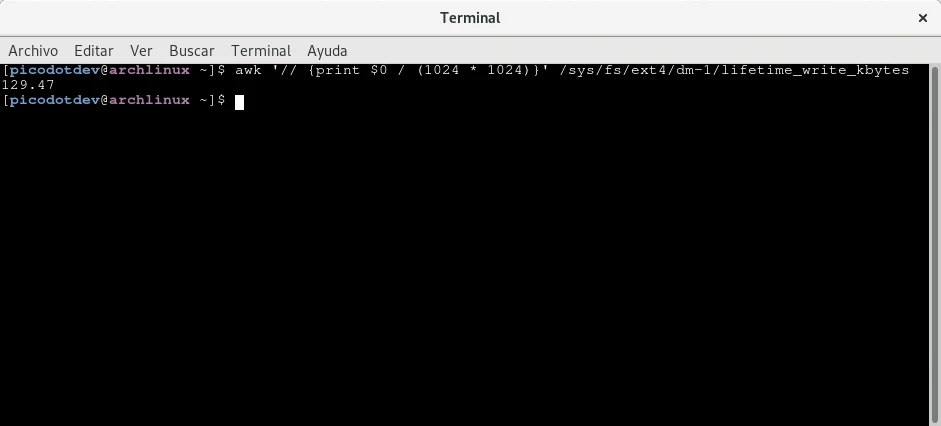 También es interesante conocer los datos escritos en la unidad en total desde su instalación, en realidad lo siguiente nos dará los GiB escritos desde la creación de la partición, si se han hecho varios particionados no será el total del tiempo de vida de la unidad. Al usar LVM on LUKS el nombre que Linux le a la unidad en mi caso es dm-1, según la configuración del sistema otro nombre que se le asigna es sda2. En esta captura de 129 GB.