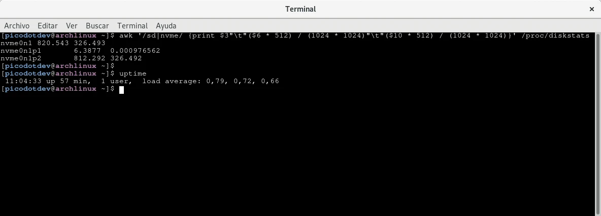 En este caso se han escrito 326 MB en el dispositivo nvme0n1p2 que corresponde a la partición root en una hora de actividad del sistema realizando tareas ofimáticas y de navegación.