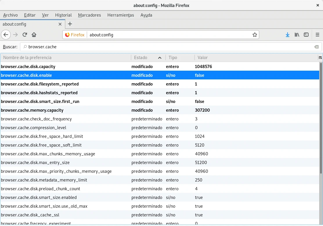 - browser.cache.disk.enable: para no realizar tŕafico de red en un futuro los recursos ya descargados como imágenes, archivos de estilo o javascript los almacena en una caché en el disco. Evita tráfico de red y mejora el rendimiento pero la caché ocupa espacio en disco y ocasiona escrituras. Cambiando el valor de esta propiedad a false se inhabilita la cache y las escrituras.
