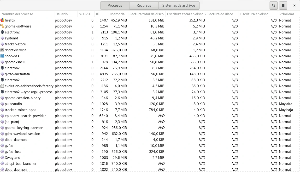 En el entorno de escritorio GNOME con la aplicación Monitor del sistema es posible ver la cantidad de datos escritos por un proceso en total y en tiempo real.