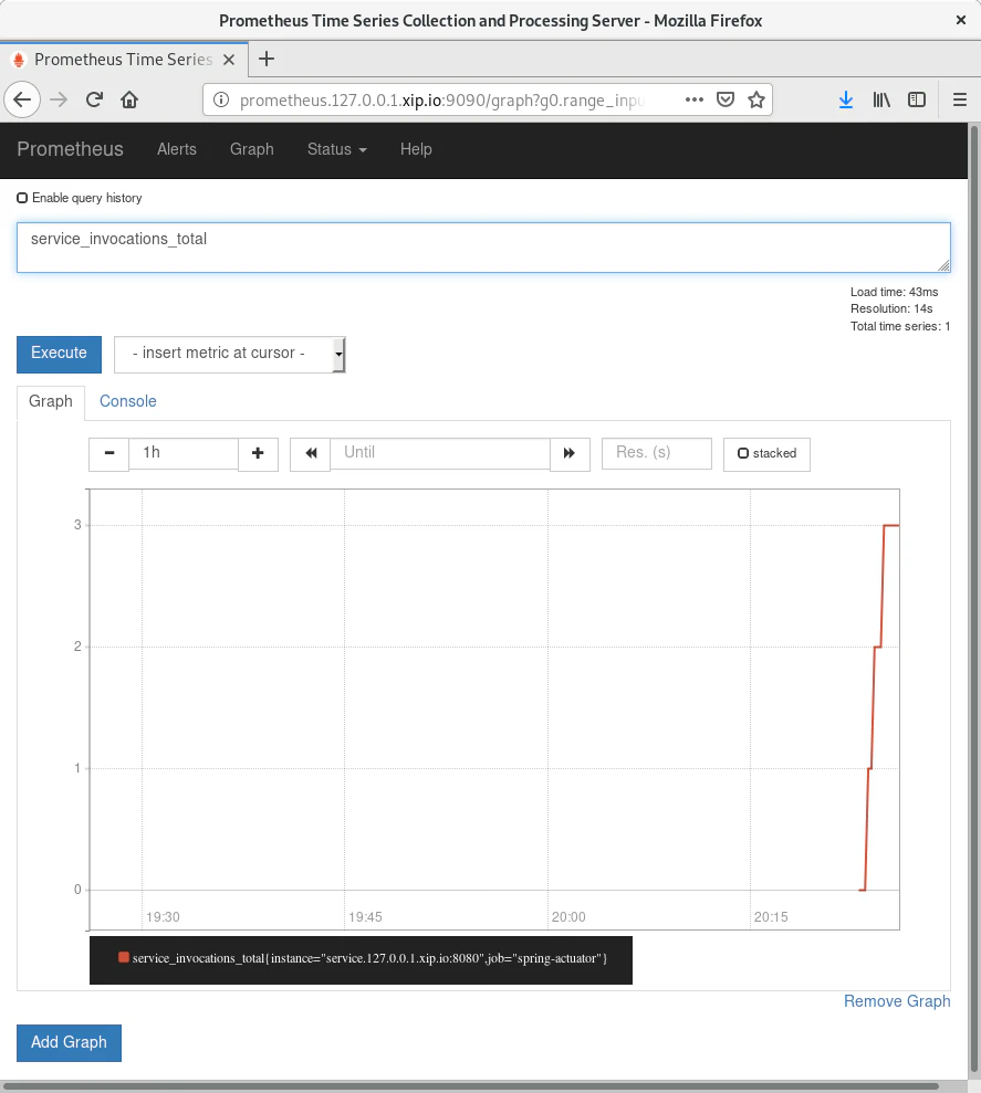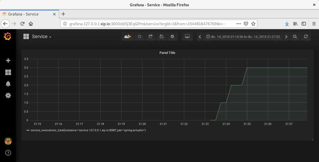 Utilizando el ejemplo que hice para la serie de artículos sobre Spring Cloud he añadido al micro servicio service un contador con el número de invocaciones que se le ha realizado. Este dato se expone en el endpoint con la clave service.invocations como se ha definido al registrar el contador en Micrometer con la clase MeterRegistry. Además de esta métrica propia del servicio Spring Boot Actuator añade otras muchas más del uso de la CPU, memoria, …