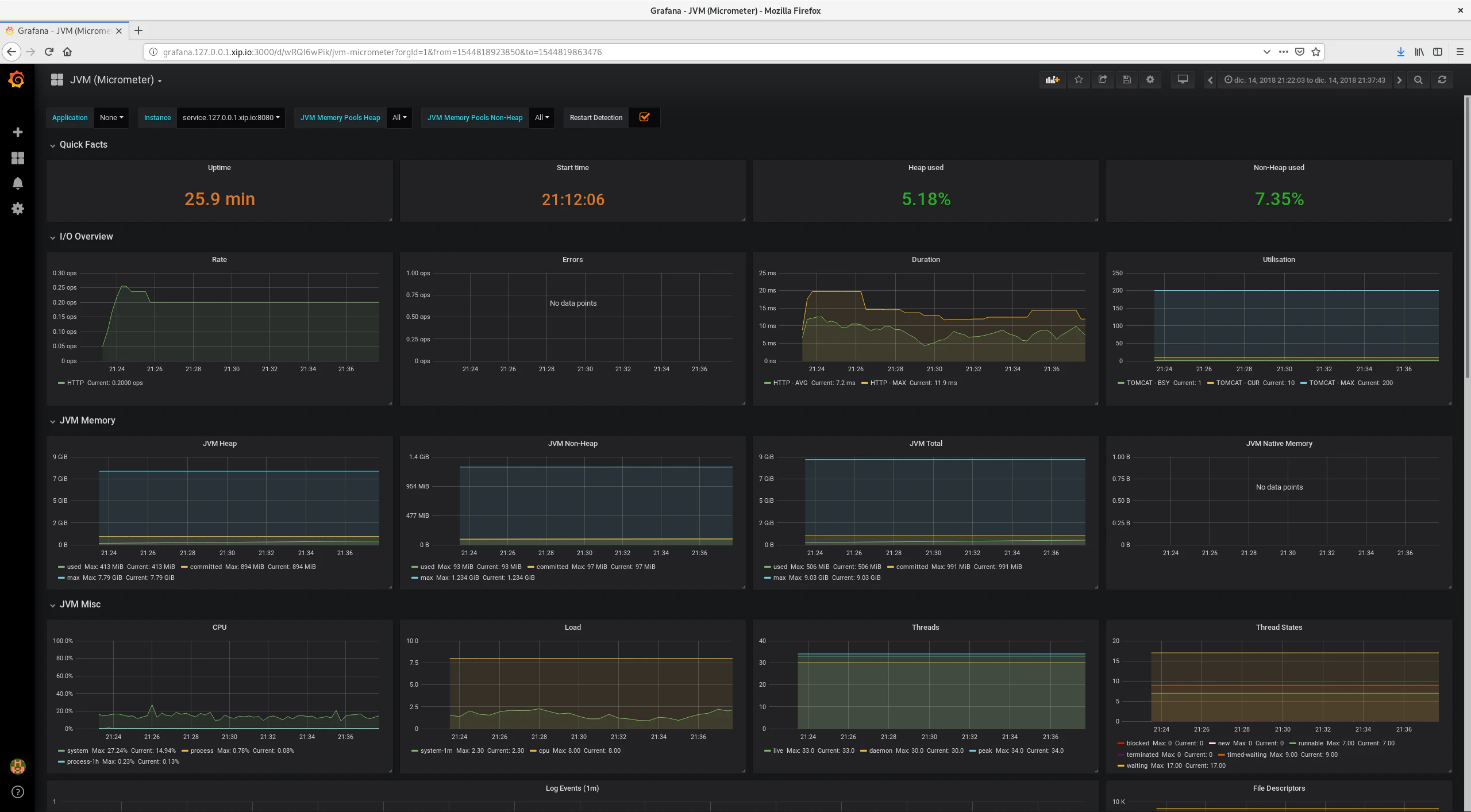 Como Spring Boot Actuator exporta muchas métricas del funcionamiento del servicio Grafana puede crear gráficas de todas ellas. No hace falta crear un dashboard desde cero, se pueden descargar e importar dashboards. Este ejemplo para Micrometer recoge la memoria de la JVM (heap y no heap), uso de CPU, carga, hilos, estado de hilos, descriptores de archivos, recolector de basura, classloader y entrada/salida básica.
