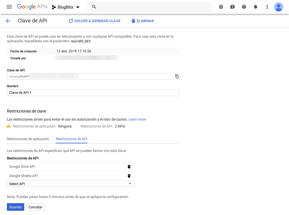Para acceder a los servicios mediante APIs hay que obtener unas credenciales. Un ejemplo es el siguiente usando un API key para acceder a una hoja de cálculo compartida para cualquier usuario que tenga el enlace o identificativo del documento en Google Drive. Cada servicio de Google ofrece una API distinta según su contexto y datos que maneja.