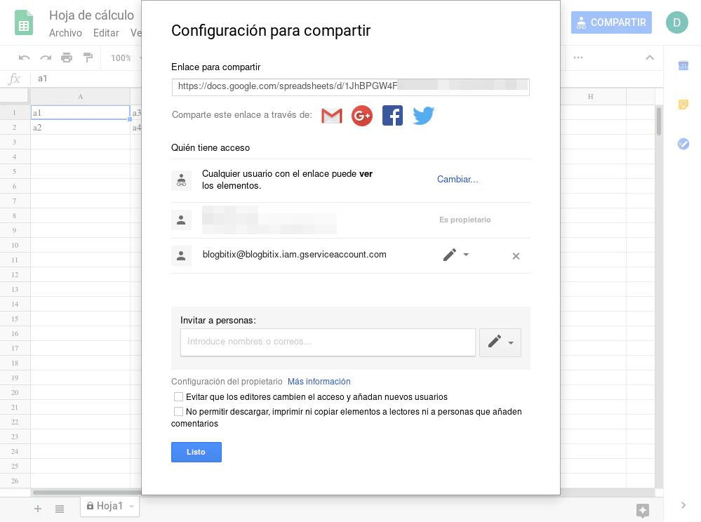Para las hojas de cálculo hay dos formas de autorización para una aplicación. Mediante una API key con permisos de utilización de la API permite acceder a cualquier documento público, compartido de forma pública o para los usuarios que tengan el enlace o identificativo del documento. La otra más segura es creando una cuenta de servicio de forma que el documento se comparta únicamente con esa cuenta de servicio como si de cualquier otro usuario se tratase en vez de hacerlo público o para cualquiera que tenga el enlace.