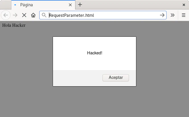En este caso al cargar la página en el navegador se muestra un mensaje alert con una ventana emergente pero si el usuario malicioso enviase los datos de las cookies a una URL suya el usuario ni siquiera sería consciente de que le han robado la sesión. Y este fallo de seguridad se produce simplemente por cargar una página de una aplicación insegura por XSS.