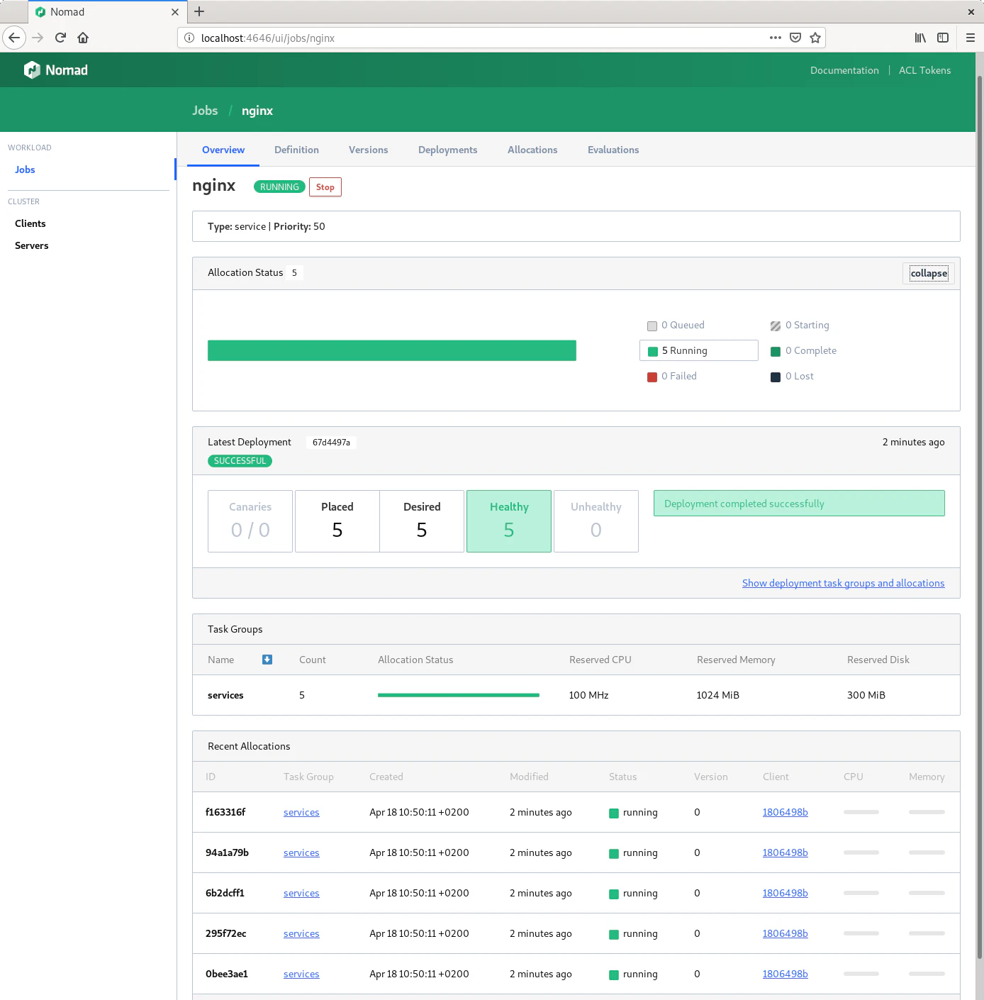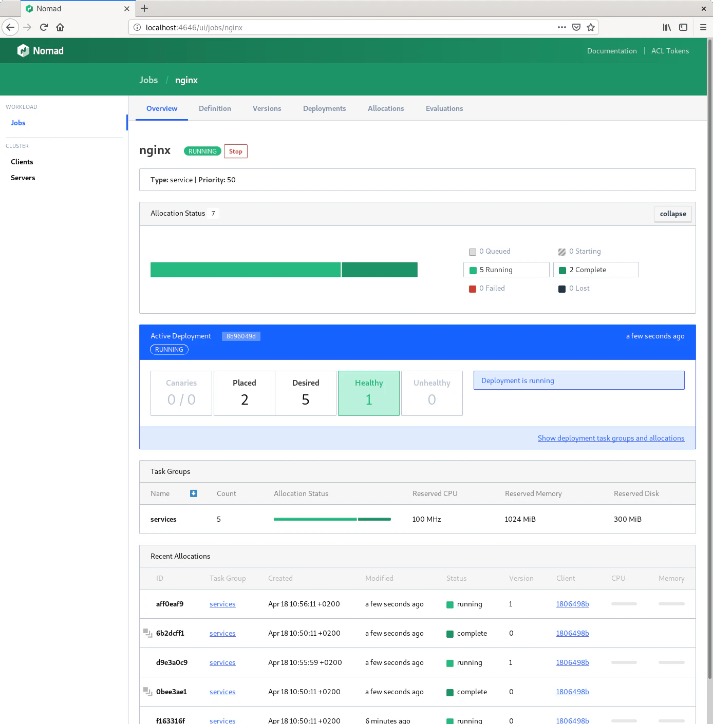 El proceso de despliegue también se puede monitorizar desde la interfaz web que ofrece Nomad.