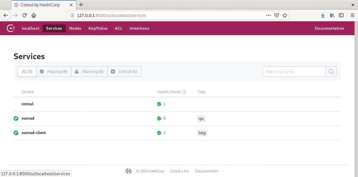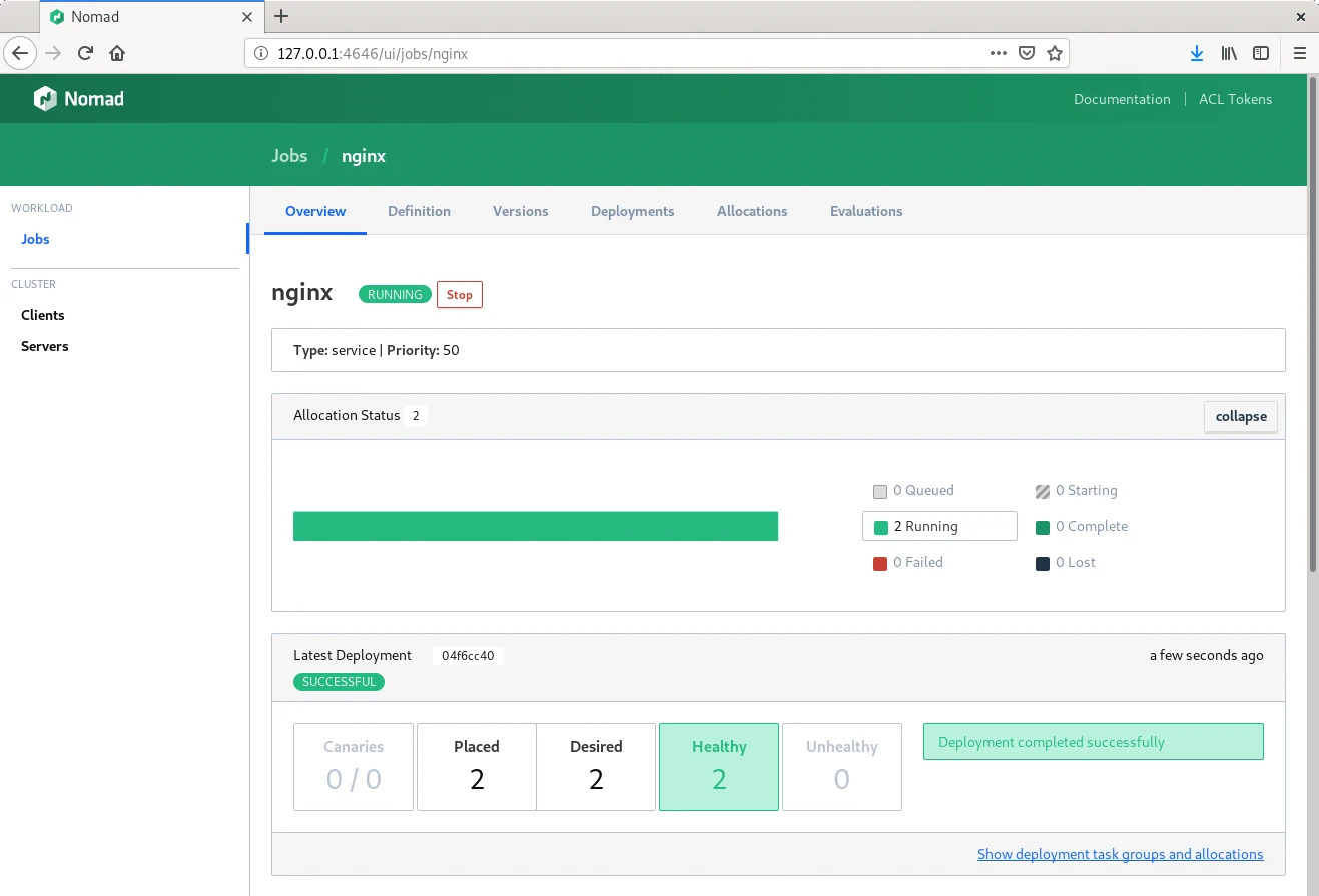 También poseen una interfaz web integrada en la que consultar la misma información, la de Consul está en el puerto 8500 y la de Nomad en el 4646 donde ver el estado de los jobs y el progreso de los despliegues.