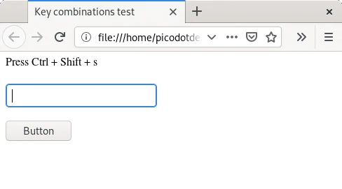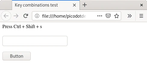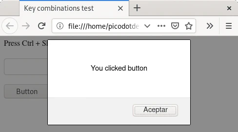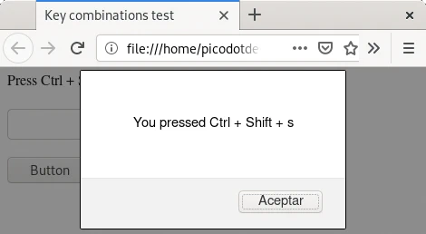 En este ejemplo se captura la combinación de teclas Ctrl + Shift + s a nivel de página que muestra una ventana emergente utilizando la función alert() de JavaScript. El objeto del evento que se recibe como parámetro del listener posee las propiedades ctrlKey, shiftKey y altKey con las que determinar además de la tecla pulsada las teclas modificadoras adicionales pulsadas al mismo tiempo.