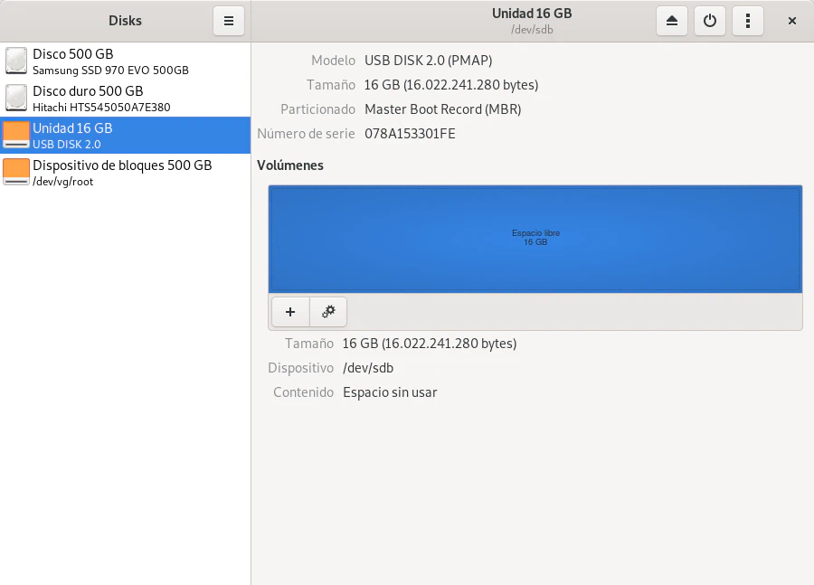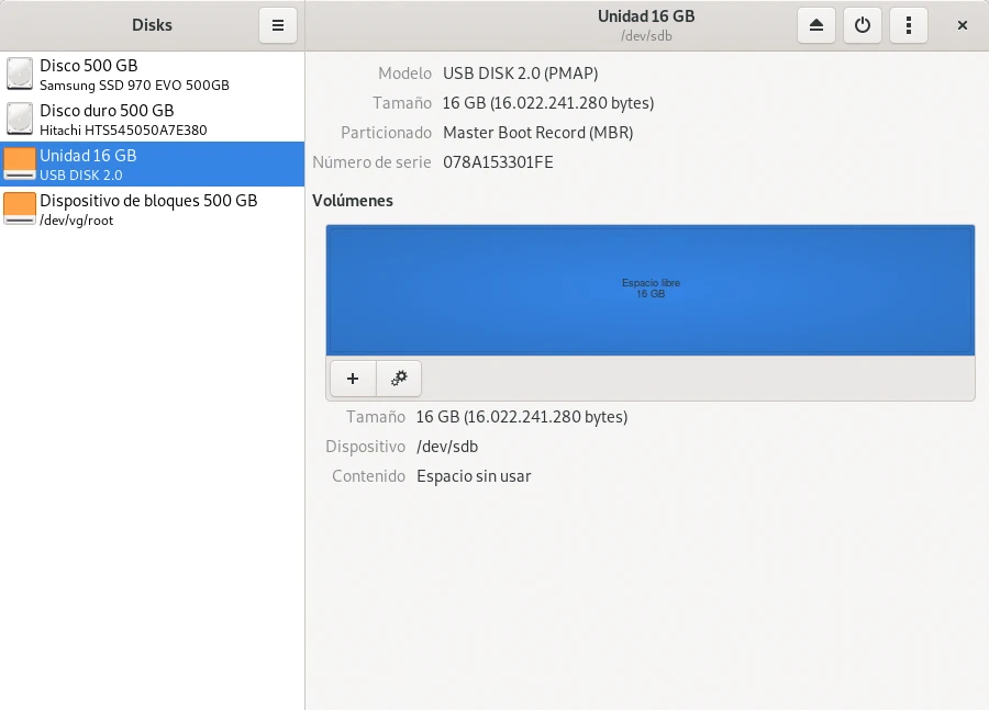En la parte izquierda se encuentra los dispositivos conectados y reconocidos por el sistema. En mi caso el disco del sistema, un Samsung 970 EVO de 500 GB, un disco duro externo USB de 500 GB y una memoria USB de 16 GB sin ningún formato.