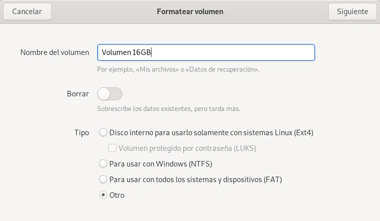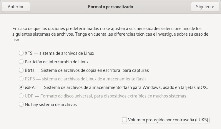 Primero es importante identificar correctamente la unidad que se quiere formatear para no perder los datos al elegir por error otra. Se introduce el nombre del volumen que identifica al dispositivo y se elige el sistema de archivos, como opciones más comunes se ofrece ext4, NTFS y FAT pero pulsando en Otro aparecen más, entre ellos exFAT. Pulsando el botón Siguiente al cabo de unos segundos la partición queda formateada con exFAT y lista para usarse tanto en GNU/Linux como en Windows, macOS o un Smart TV.