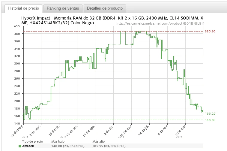 Los precios en Amazon varían sensiblemente en el caso de las memorias y productos de tecnología, he visto momentos que están a 300 €, otros a 380 € y en los últimos meses han bajado de precio casi a la mitad. Con CamelCamelCamel se puede saber si el producto está en uno de esos picos altos o en uno de los bajos, conociendo si el momento de compra es bueno. Conocer la evolución de los precios y algunas de las fechas de los lanzamientos de productos como procesadores, gráficas o cambios de tecnología como pasará de DDR4 a DDR5 permite hacer una compra más informada. Pero tampoco es recomendable esperar indefinidamente ya comentaba en sobre el rápido avance de la tecnología es una constante y siempre hay a unos meses o un año vista un nuevo producto que mejore el pasado.