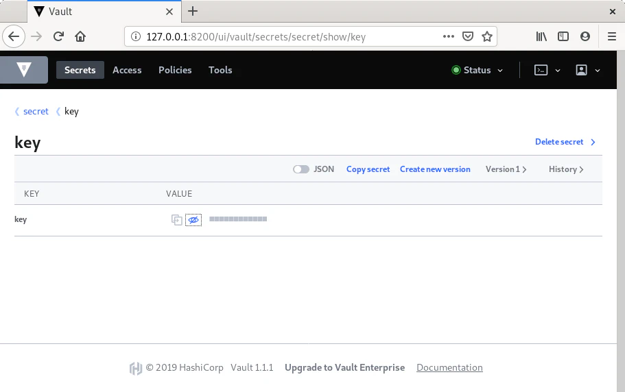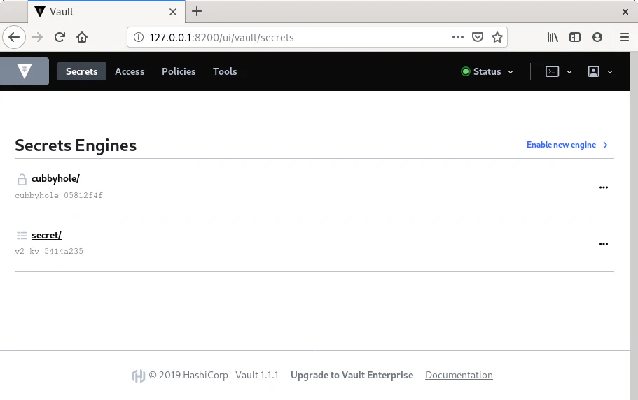 Vault al igual que otras de las herramientas de HashiCorp como Consul y Nomad posee una interfaz gráfica accesible mediante el navegador que permite realizar las mismas operaciones que a través de la API o desde la linea de comandos.