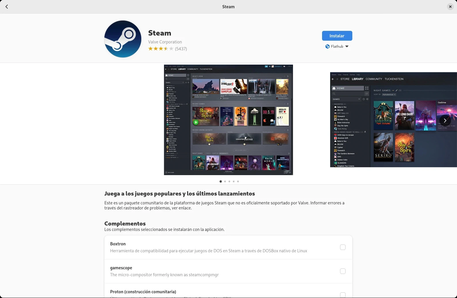 Aunque las distribuciones como Arch Linux ofrecen paquetes del cliente de Steam rquieren activar el repositorio multilib para paquetes de 32 bits. Otra forma más sencilla de instalar el cliente de Steam e independiente de la distribución es utilizar la versión en formato Flatpak de Steam. Usando el cliente de software de GNOME se hace de forma gráfica simplemente haciendo una búsqueda y un clic en el botón de instalar.