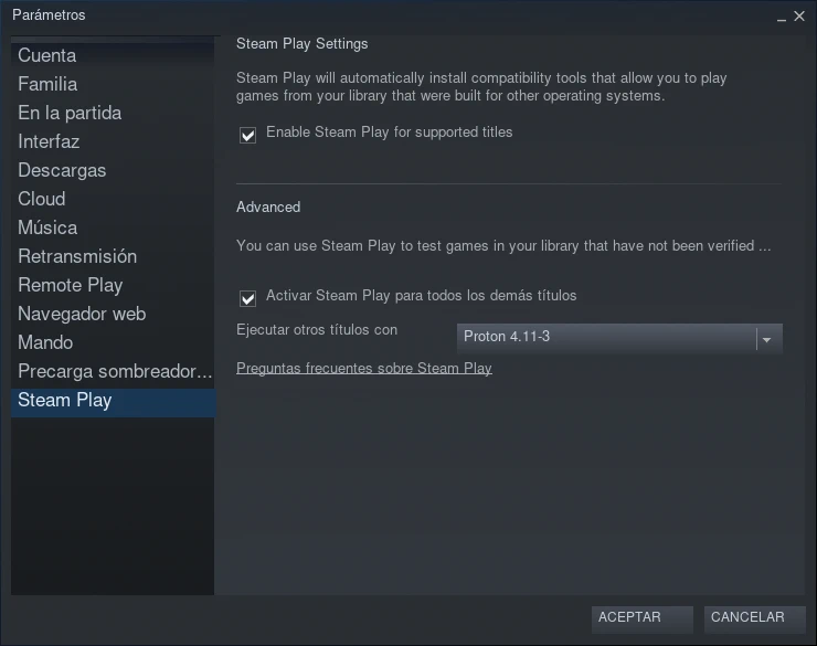 Los juegos ofrecen diferente nivel de soporte para GNU/Linux, para Windows, macOS y Steam+Linux, los que deben funcionar sin problema son los de la última categoría. Los de Windows pueden funcionar a través de una capa de emulación desarrollada por Steam, para activarla hay que ir a Steam > Parámetros > Steam Play y activar las opciones Enable Steam Play for Supported title y Activar Steam para todos los demás títulos. Sin embargo, no hay garantía que los juegos con solo soporte de Windows funcionen correctamente, he probado con World of Warships y no se iniciaba correctamente mostrando únicamente una pequeña ventana negra.