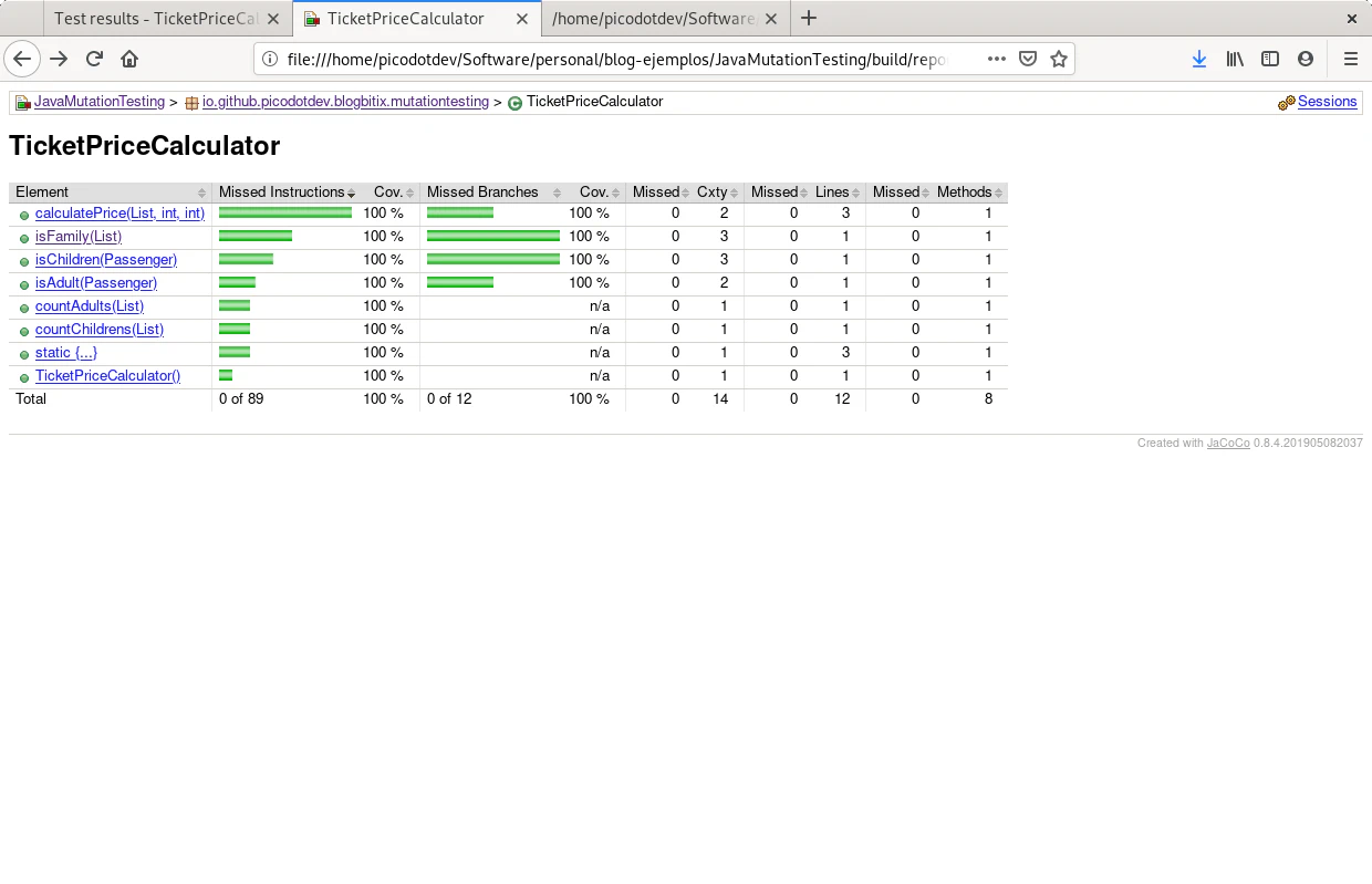 La siguiente batería de teses proporciona una cobertura de teses del cien por cien tanto para la cobertura del código como para las mutaciones como se muestran en los informes de JaCoCo para la cobertura de código y de PIT para la cobertura de mutaciones, después de haber realizado cambios tanto en el código como en los teses para obtener estos resultados.