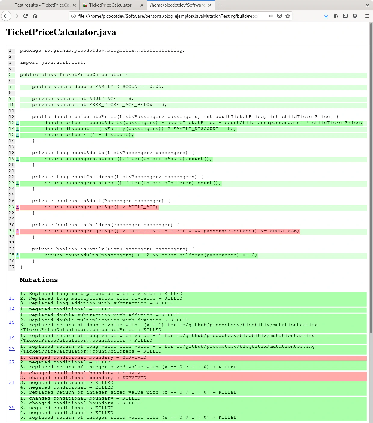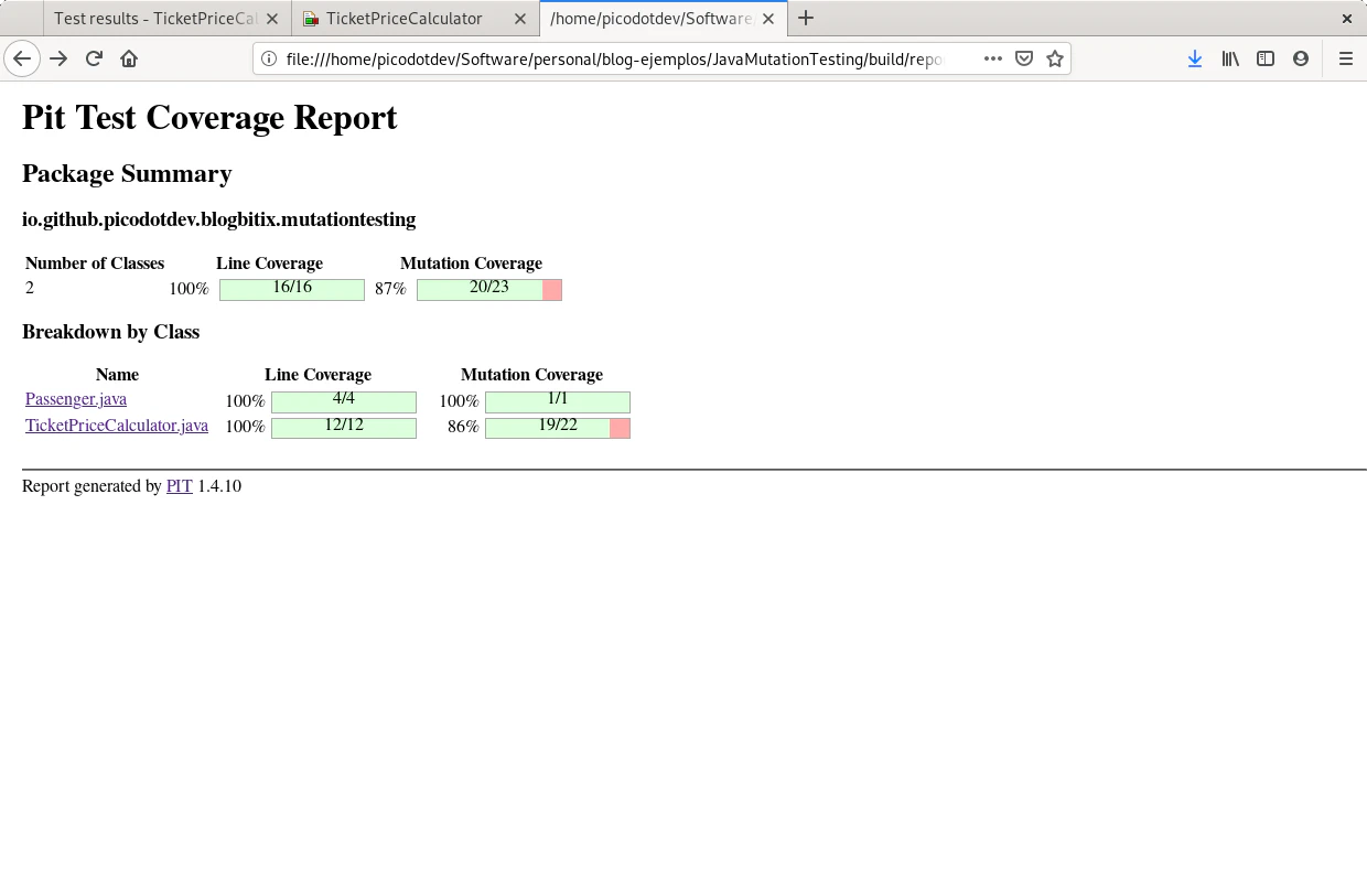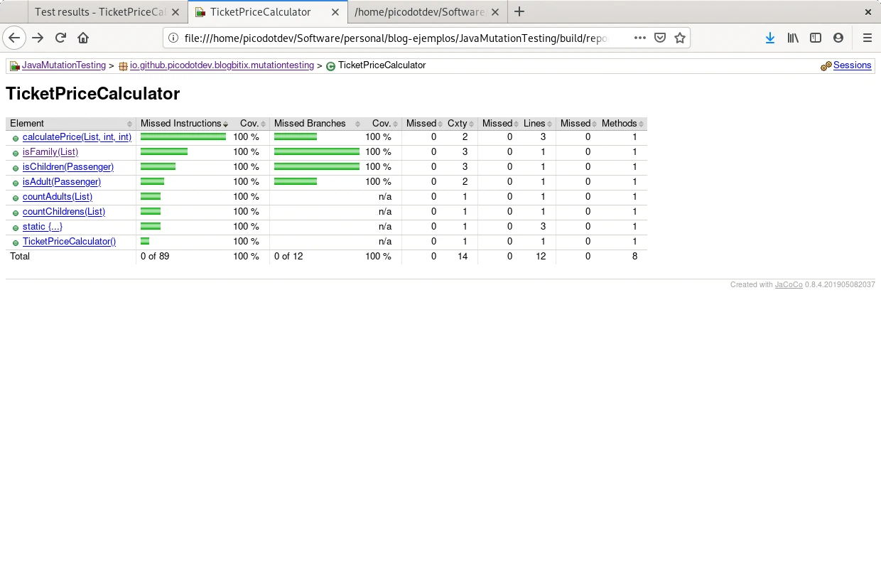 El caso de prueba calculatePriceForFamily prueba que una familia esté formada por 2 adultos y 2 menores, PIT realiza las mutaciones para considerar una familia en el caso de ser de 3 adultos o 3 menores, la prueba de calculatePriceForFamily mata estas mutaciones haciendo que los teses sean precisos y completos. La cobertura de teses de mutación llega al cien por cien. En el informe de PIT se observa una descripción y número de mutaciones que ha realizado entre ellas divisiones en vez de multiplicaciones, sustracciones en vez de sumas, reemplazo de valores de retorno o cambios y negaciones en condicionales. Los teses calculatePriceForNoFamilyByNoAdults y calculatePriceForNoFamilyByNoChildren completan la cobertura de todas las ramas del método isFamily.