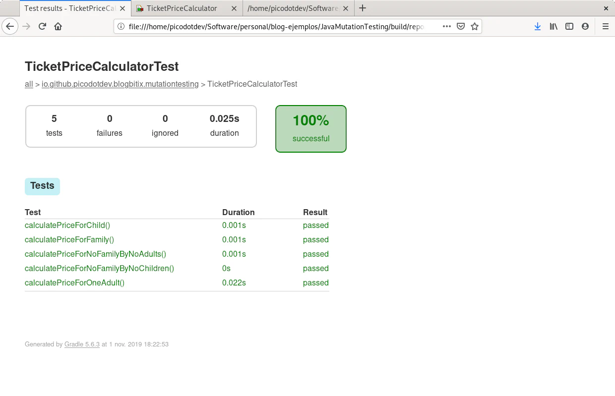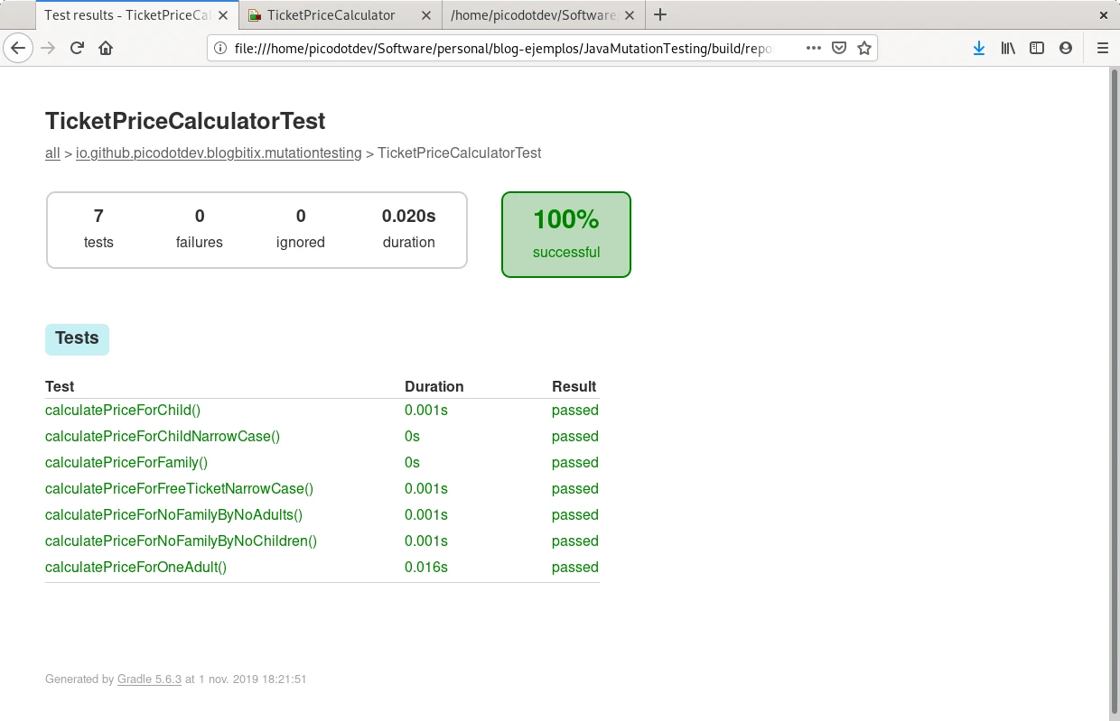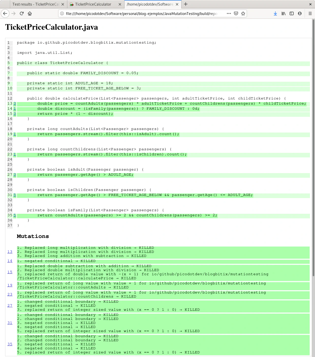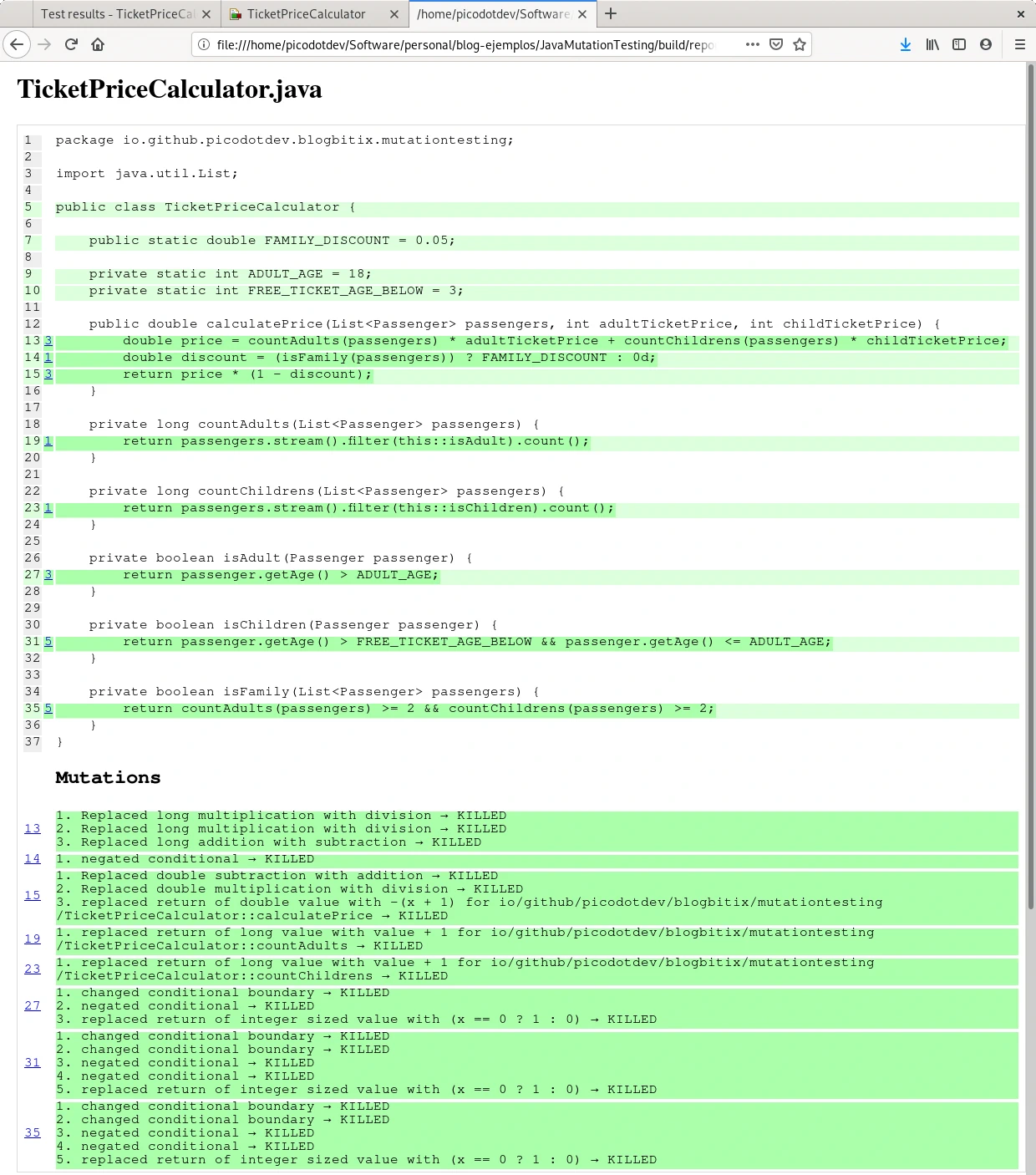 El caso de prueba calculatePriceForFamily prueba que una familia esté formada por 2 adultos y 2 menores, PIT realiza las mutaciones para considerar una familia en el caso de ser de 3 adultos o 3 menores, la prueba de calculatePriceForFamily mata estas mutaciones haciendo que los teses sean precisos y completos. La cobertura de teses de mutación llega al cien por cien. En el informe de PIT se observa una descripción y número de mutaciones que ha realizado entre ellas divisiones en vez de multiplicaciones, sustracciones en vez de sumas, reemplazo de valores de retorno o cambios y negaciones en condicionales. Los teses calculatePriceForNoFamilyByNoAdults y calculatePriceForNoFamilyByNoChildren completan la cobertura de todas las ramas del método isFamily.