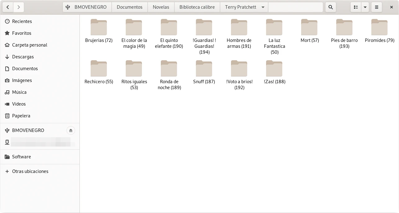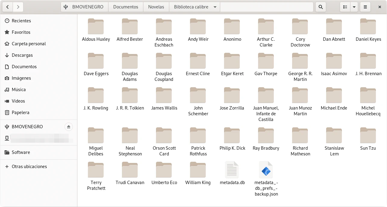 La biblioteca se guarda en el sistema de archivos del ordenador en una estructura de directorios organizados por autor, títulos del libro y en los formatos en los que se haya realizado la conversión.