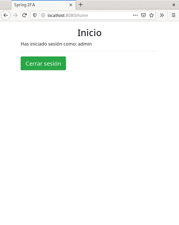 El primer paso de la autenticación utilizando 2FA es introducir el usuario y contraseña. El segundo paso es introducir el código del segundo factor de autenticación. Introducidos ambos el usuario es redirigido a la página de inicio.