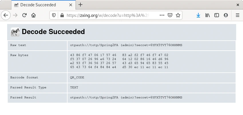 El código QR es una imagen generada a partir del código secreto y una información adicional que al usuario le permite identificar la cuenta, hay webs que permiten decodificar una imagen QR para analizar que información incorpora, en esta la información de la cuenta Spring2FA (admin) y el secreto 6YFX5TVT76OHHNMS utilizado para generar los códigos temporales. En el HTML devuelto se incluye una imagen con la información embebida en el enlace de la imagen, la imagen se genera por un servicio de Google.