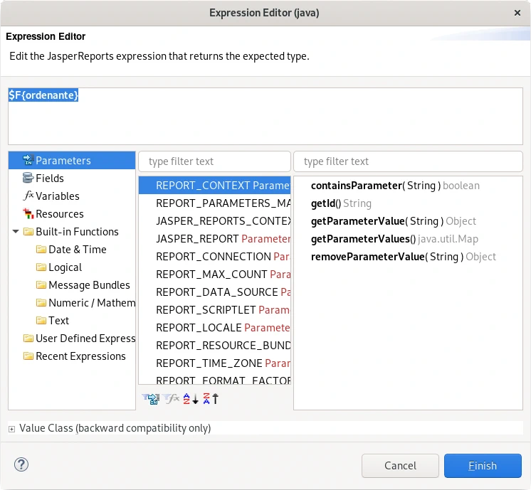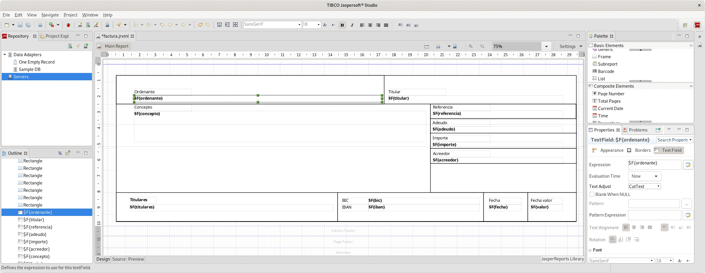 Utilizando los elementos de la paleta como campos de texto e imagen y posicionándolos en el lugar adecuado sobre el informe se crea la plantilla del documento. Para asignar valores a los elementos se inserta una expresión que en este caso permite obtenerlo de los parámetros que se le proporcionen al informe a los cuales con funciones incorporadas se les puede aplicar transformaciones para obtener el valor deseado (de fecha, lógicas, numéricas o de texto).