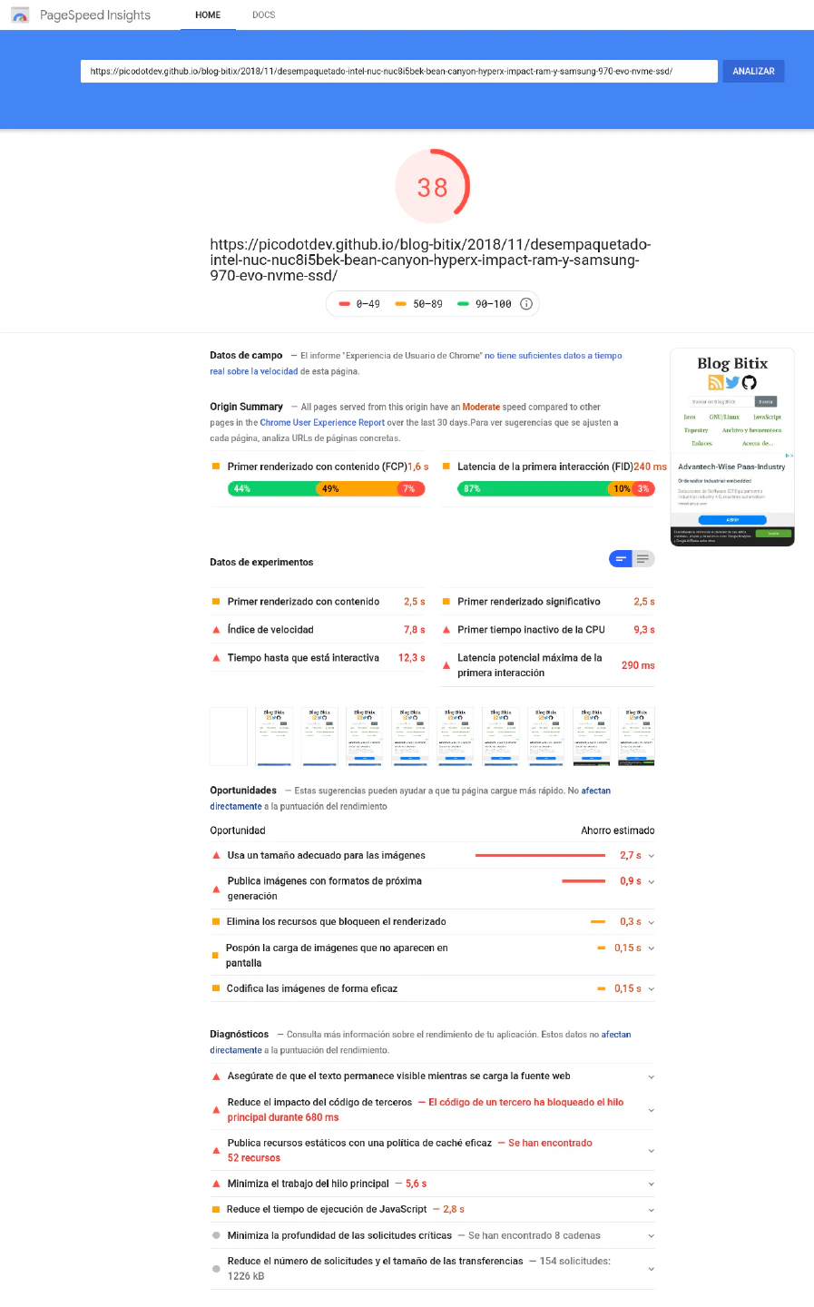 Los artículos de mi blog como Desempaquetado de PlayStation 4 Slim de 1 TB o Desempaquetado Intel NUC8i5BEK (Bean Canyon), HyperX Impact (RAM) y Samsung 970 EVO NVMe (SSD), incluyen numerosas imágenes e iframes de vídeos de Youtube y publicidad de Amazon, en todas se carga los comentarios de Disqus y para compartir los artículos con ShareThis que están al final de la página y hasta que el usuario no ha leído el artículo son innecesarios. Disqus además en concreto para cargarse realiza numerosas peticiones adicionales. Estás páginas son de las más complejas por número de recursos y extensión del artículo que tengo en el blog por lo que he analizado una de ellas antes y después aplicando lazy loading para cargar inicialmente solo los elementos que se visualizan que son aquellos que están en la parte superior de la página.