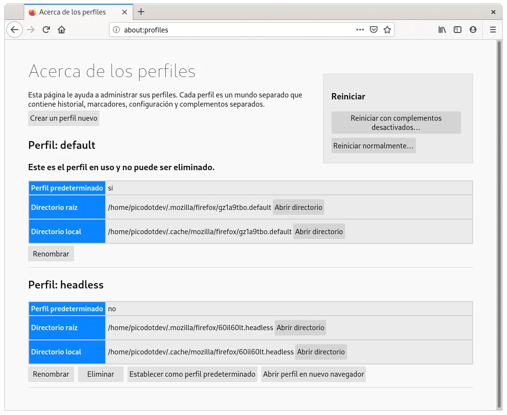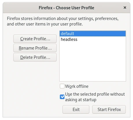 El parámetro -P indica el perfil a usar y hay que crear uno para tomar capturas de pantalla al mismo tiempo que está abierto el perfil personal en una ventana gráfica del navegador. Hay varias formas de crear un nuevo perfil en Firefox. Desde la página de configuración about:profiles, con el gestor de perfiles o desde la línea de comandos.