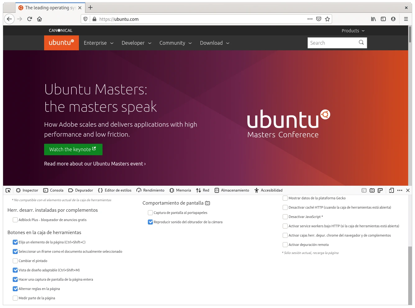 Firefox también permite tomar capturas de pantalla desde la interfaz gráfica, con el botón derecho y la opción del menú emergente Hacer una captura de pantalla de la pantalla completa o de la parte visible en ese momento o también desde el Inspector que se muestra con el botón derecho y la opción Inspeccionar elemento y habilitando la opción Hacer una captura de pantalla de la página completa y si se desea Captura de pantalla al portapapeles con las opciones de los ajustes.