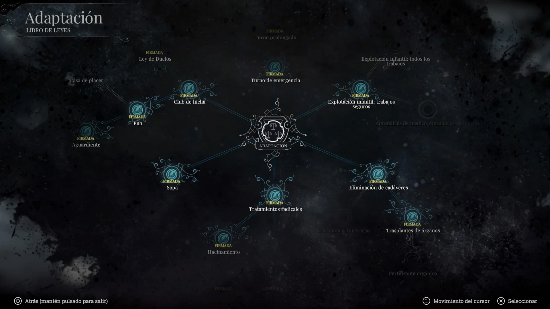 La firma de leyes permite establecer políticas que proporcionan algunas ventajas como poder usar niños en algunas tareas. Son un árbol de desarrollo. Algunas son establecer turnos de trabajo nocturnos, proporcionar sopa en vez de raciones completas, construir un nevero para los colonos que perezcan o mejorar las atenciones médicas. Cada vez que se firma una ley hay que esperar un tiempo hasta poder firmar la siguiente, es aconsejable que cada vez que se pueda inmediatamente firmar la siguiente que proporcione la mayor ventaja que se considere sin embargo hay que tener en cuenta que algunas requieren construir algún edificio en un determinado tiempo, un día o dos, de modo que hay que tener preparados los recursos necesarios para poder construir esos edificios.