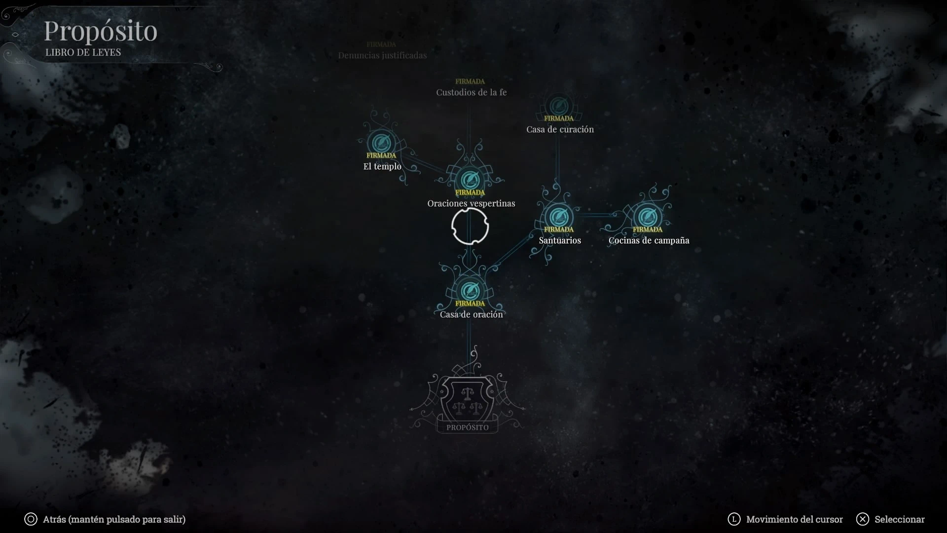 Algunos edificios que permiten tener controlado los niveles de descontento bajos y la esperanza alta son las zonas de peleas, las iglesias, la taberna y el importante templo con los custodios de la fe en la rama de propósito. Se tiene acceso a estos edificios promulgando sus respectivas leyes. En el árbol de leyes en un determinado momento se ha de optar por el árbol de la fe y esperanza o del orden que da acceso a un nuevo árbol de leyes.