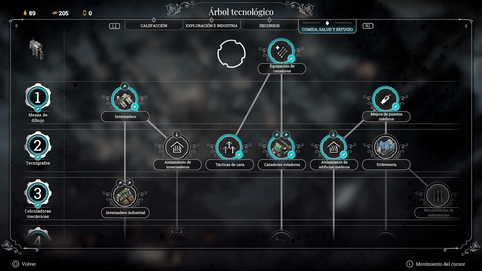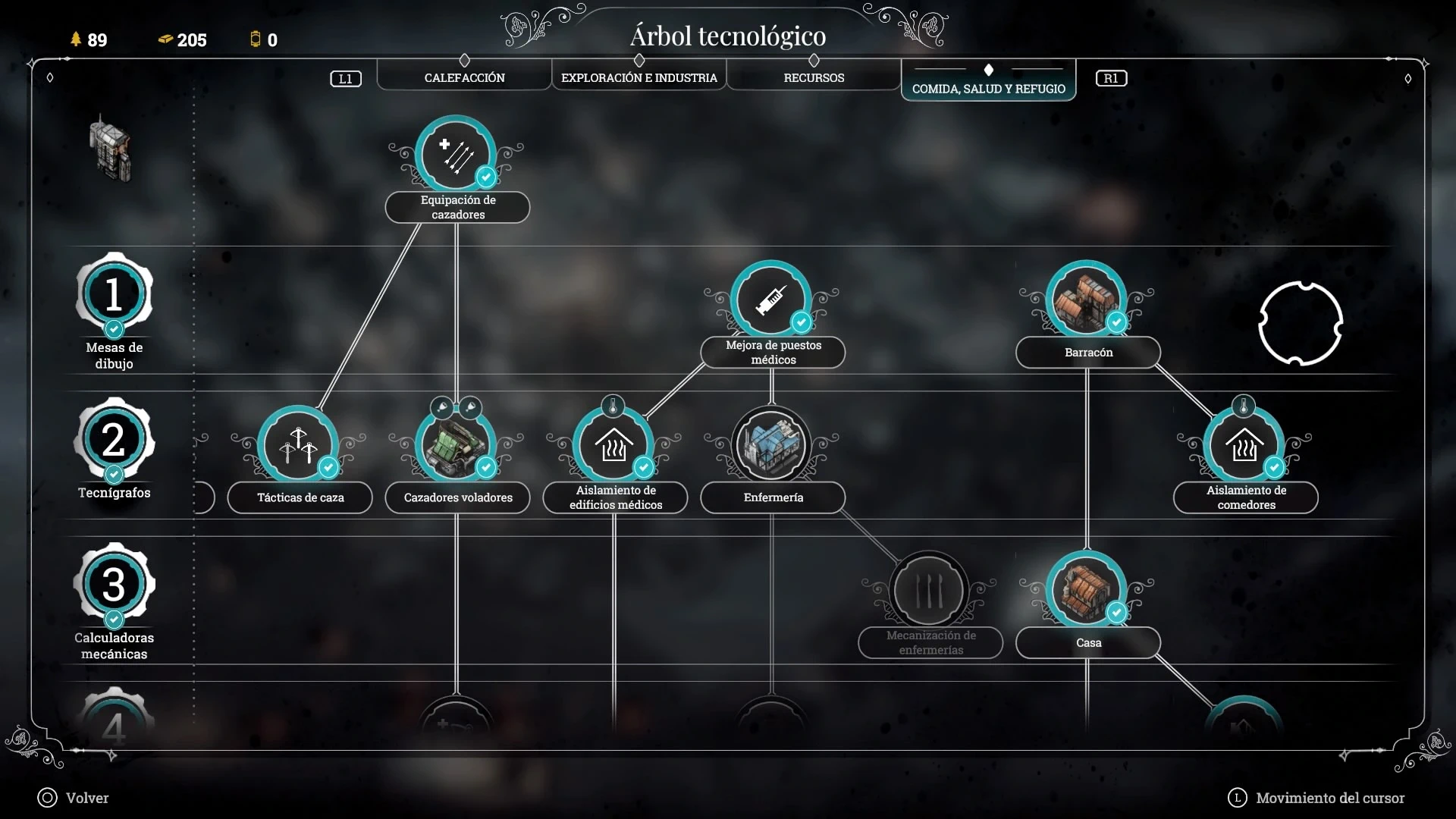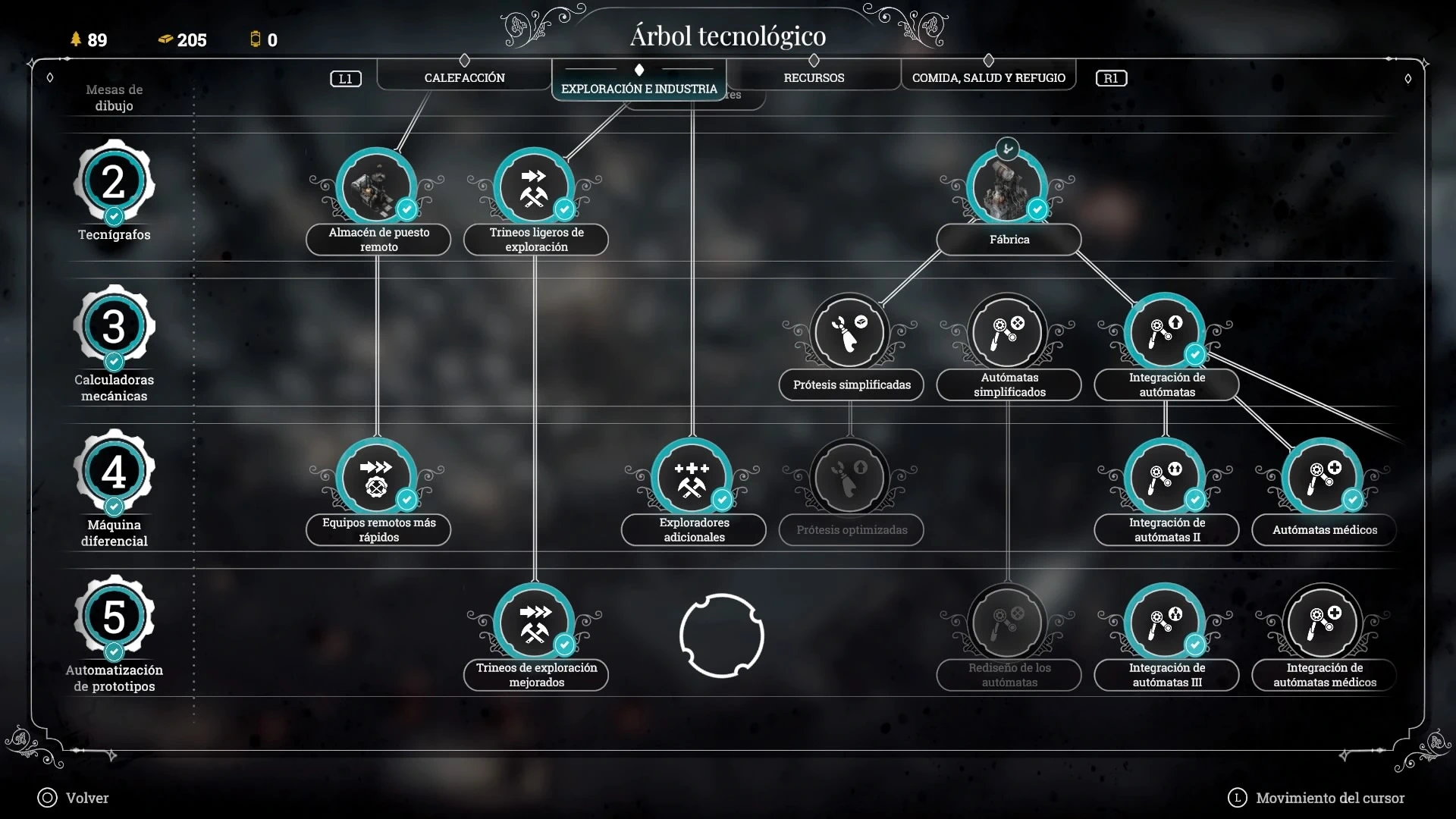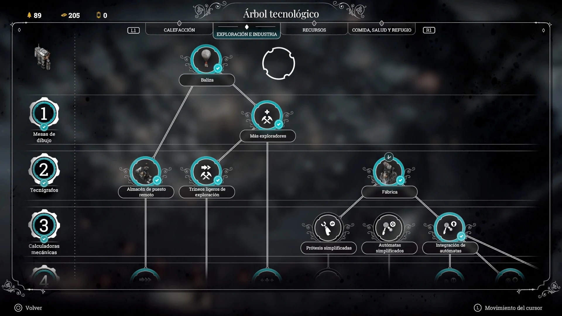 El otro árbol de desarrollo son las investigaciones proporcionadas por los talleres. Estos proporciona mejoras tecnológicas de caza, de poder construir nuevos edificios, avances para hacer más eficientes a los trabajadores, minas, construir autómatas o mejorar el generador. Inicialmente las más interesantes serán las dedicadas conseguir recursos. Los avances tecnológicos se dividen en niveles, no hace falta desarrollar todos los de un nivel siguiente pero cada nivel ha de ser investigado para tener acceso él.