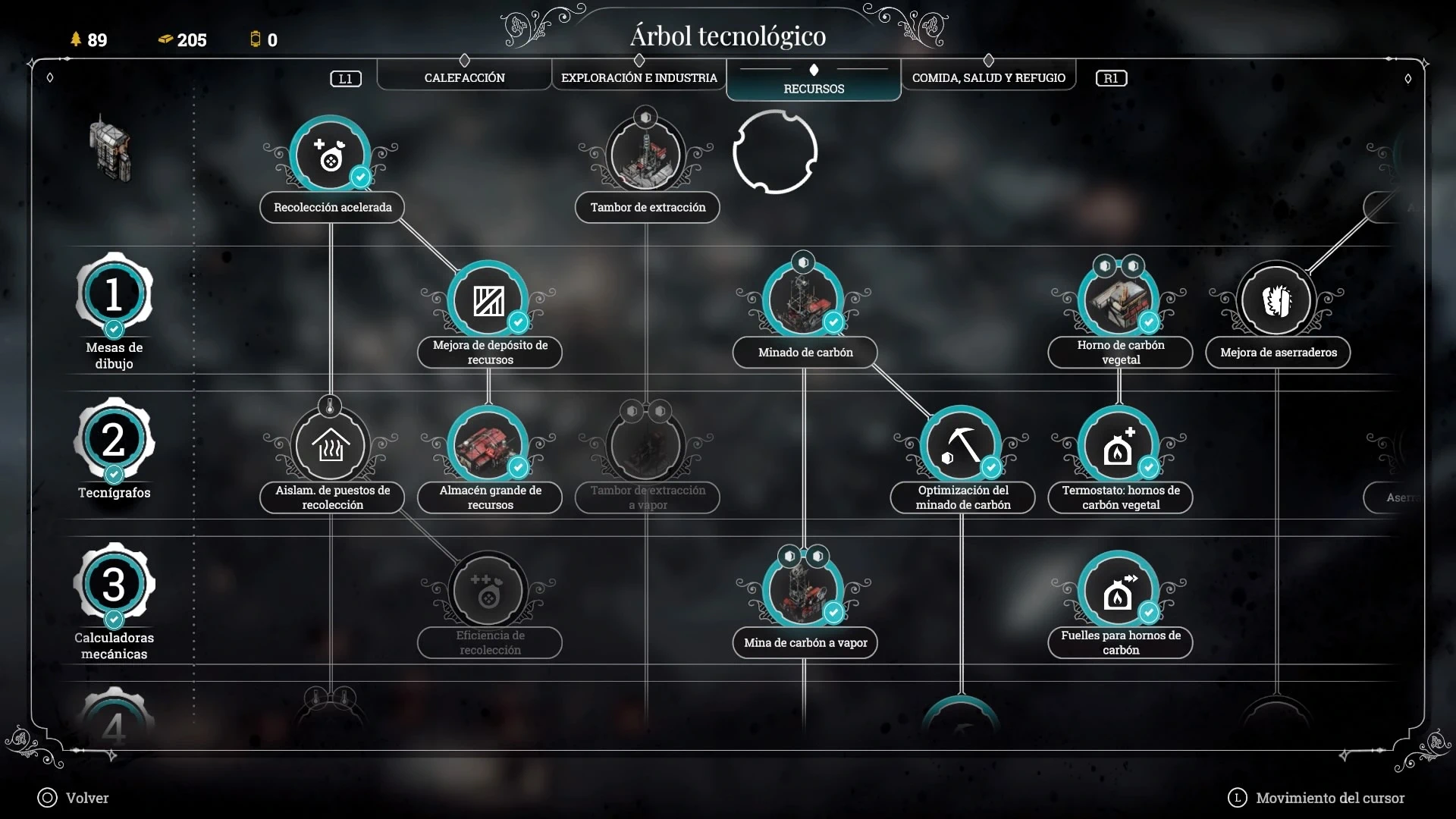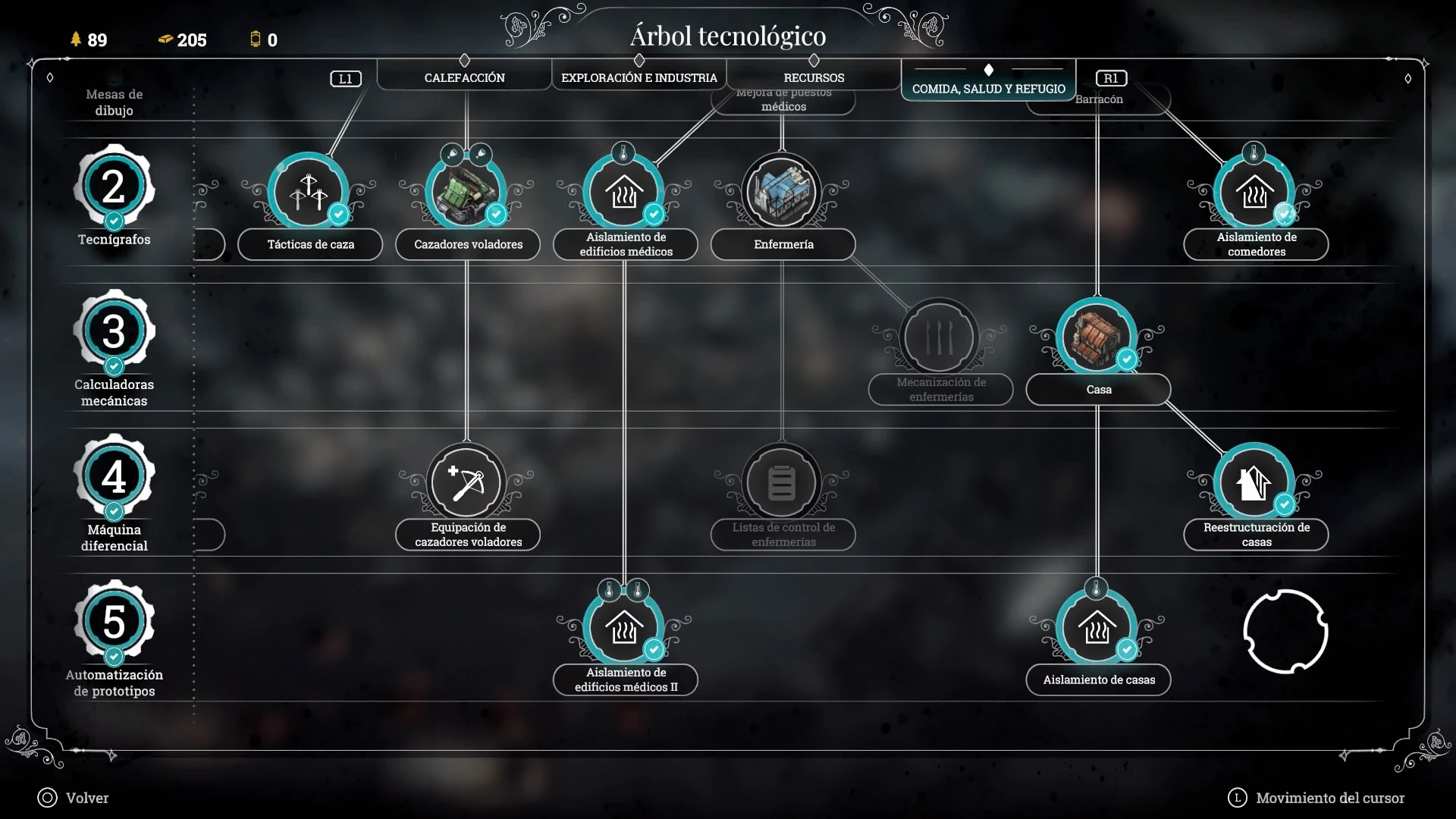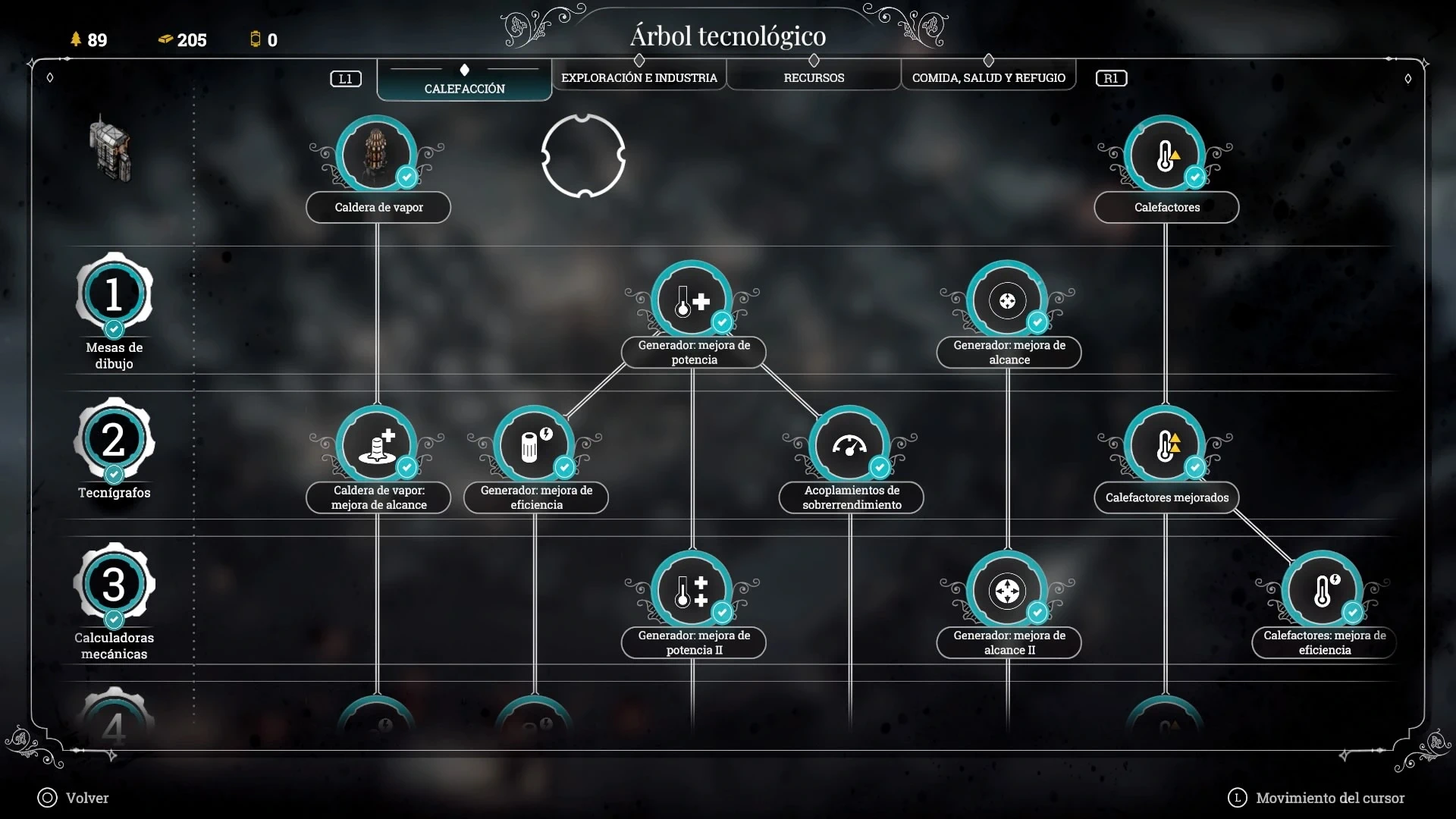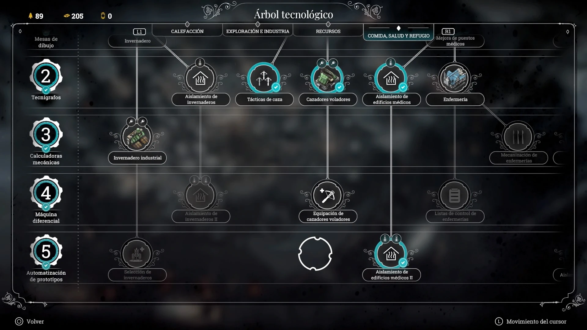El otro árbol de desarrollo son las investigaciones proporcionadas por los talleres. Estos proporciona mejoras tecnológicas de caza, de poder construir nuevos edificios, avances para hacer más eficientes a los trabajadores, minas, construir autómatas o mejorar el generador. Inicialmente las más interesantes serán las dedicadas conseguir recursos. Los avances tecnológicos se dividen en niveles, no hace falta desarrollar todos los de un nivel siguiente pero cada nivel ha de ser investigado para tener acceso él.
